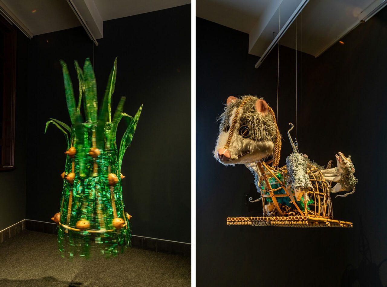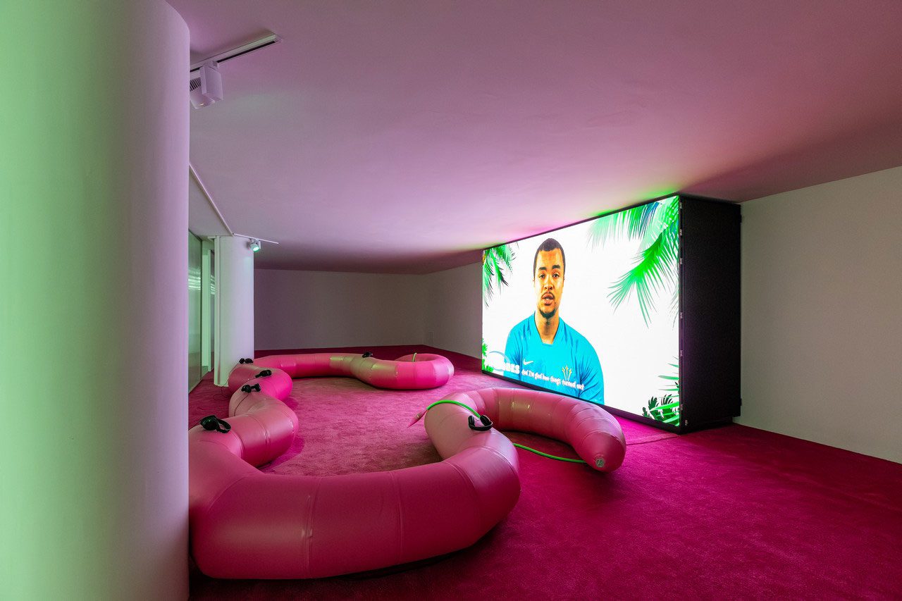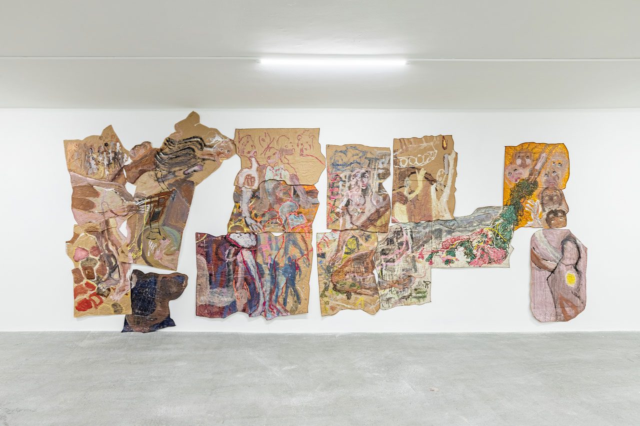 Stéphanie Saadé’s “Pyramid” (2022) series is composed of everyday clothing items, such as socks, T-shirts and leggings layered and sewn into one another in an incremental fashion, from the smallest infant size to largest adult sizes. Forming a gently sloping, vertical silhouette, the works resemble a stratified monument of growth and care, testifying to the evolution of intimate matter as well as its relationship to the body. The resulting structure is both familiar and uncanny: a cartography of life stages that materialises time as both visible and tactile. With “Pouring Without End and Spilled in Good Faith” the artists duo, VASKOS (Vassilis Noulas & Kostas Tzimoulis) revisits the iconography of ‘Greekness’, an idea sustained by the Greek state and tourism industry in attempts to monetise history. Within the vividly coloured visual realm of the textile panels, the duo take up the symbol of the jug or amphora, which has long been a shorthand symbol for Hellenic identity in the historicisation of Greek civilisation and mythology. Here, depictions of the artists themselves are interwoven with motifs from classical antiquity and other ornamental icons. Naomi Rincón-Gallardo’s “Resiliencia Tlacuache / Opossum Resilience” (2019) is part of “A Trilogy of Caves”, which is a series of politically grounded yet playfully psychedelic videos inspired by and shot in the Mexican state of Oaxaca. Oaxaca continues to experience the deleterious effects of land dispossession, such as those in the wake of recent aggressive mining concessions that have exacerbated existing social conflicts. Blending surreal and psychedelic imagery, the installation features a projected video surrounded by suspended sculptures – costumes and accessories worn by the characters on screen – elaborating a multi-layered aesthetic where layers of reality and mythology are continually subverted. Overlapping the deep time of creation with the contemporary socio-environmental reality of a mining project imposed on an Indigenous territory, the film is directly informed by research and interviews done by Rincón-Gallardo with Zapotec lawyer and activist Rosalinda Dionicio about resistance, art, ancestral memory and fiction. “A Horn That Swallows Songs” (2025) by Doruntina Kastrati investigates the residual cost of invisible labour – particularly that performed by women – in Istanbul’s Turkish Delight (lokum) factories. The installation unfolds across two rooms, generating an immersive environment that echoes the conditions of the factory floor: endless shifts, repetitive rhythms and prolonged standing. Meanwhile, low-frequency vibrations emanating from ultrasonic speakers, floor transducers and sub-woofers travel through the floor into viewers’ bodies, transmitting a visceral bodily sensation. At the heart of the installation stands a polished metal structure embedded with four video screens. Each screen displays documentary footage drawn from Kastrati’s field visits to lokum factories, including interviews with workers. One video features a single narrator’s voice taken from interview transcripts, highlighting the gap between the workers’ realities and the sanitised versions of management, further underscoring the enforced silence and controlled narratives surrounding their labour. While the presence of supervisors in these interviews is subtle, their influence remains palpable – shaping not only the workers’ conditions, but also their capacity for speech, expression and disclosure. In an adjoining room, a sculpture fashioned from repurposed factory machinery takes the form of a horn-like vent, recalling those used in halva-making and underscoring the entanglement between sound, labour, and architectures of production.