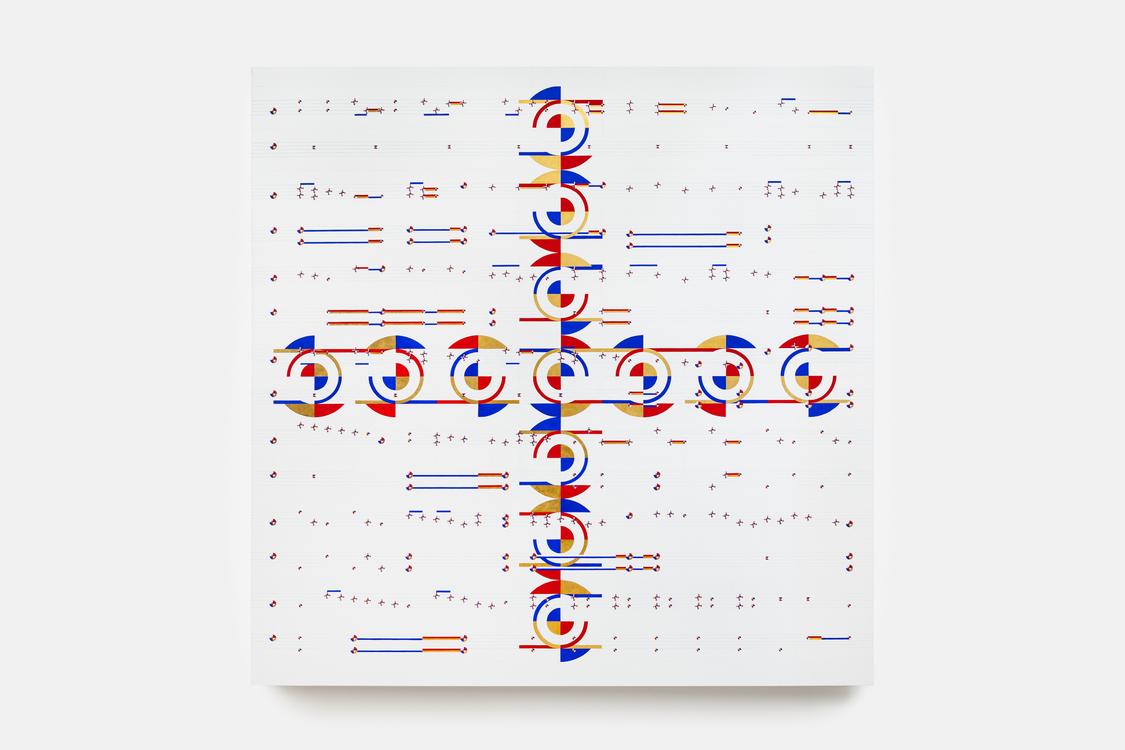 Orozco has devised a chromatic vocabulary—red, white, blue, and gold—through which each composition is reborn. Yet these are not literal transcriptions. They are reverberations, echoes made visible. Color becomes tone; rhythm becomes geometry. In this translation, the strictness of notation dissolves into a quiet abstraction where structure meets intuition, where control and chance interlace like melody and silence.