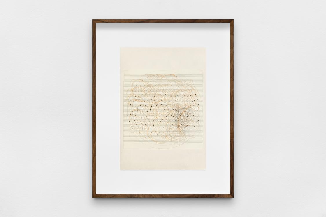 In his drawings, Orozco allows the line to wander freely. These works, which he calls fictions, are less bound by rule, more by reverie. Circles drift between the five lines of the stave—miniature constellations suspended in imagined space. The horizontal bands recall textiles or woven threads, suggesting that each piece, like a fabric of sound, is both measured and infinite.