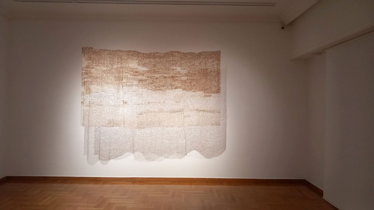In his exhibition “Safe Area” at CITRONNE Gallery, Nikos Podias invites us to reconsider what safety truly means — not as the absence of danger, but as a subtle balance between resilience and vulnerability. With dedication, precision and patience, he transforms humble, once-discarded materials — used tea bags, cigarette foils, Japanese paper — into surfaces that recall mosaics, delicate textiles or even skins of creatures. In a persistent, almost meditative process of assembly, he traces a visual language of protection, crafting “skins” and “armors” of paper and light, meshes and talismans that — though made of delicate matter — radiate a quiet inner strength.