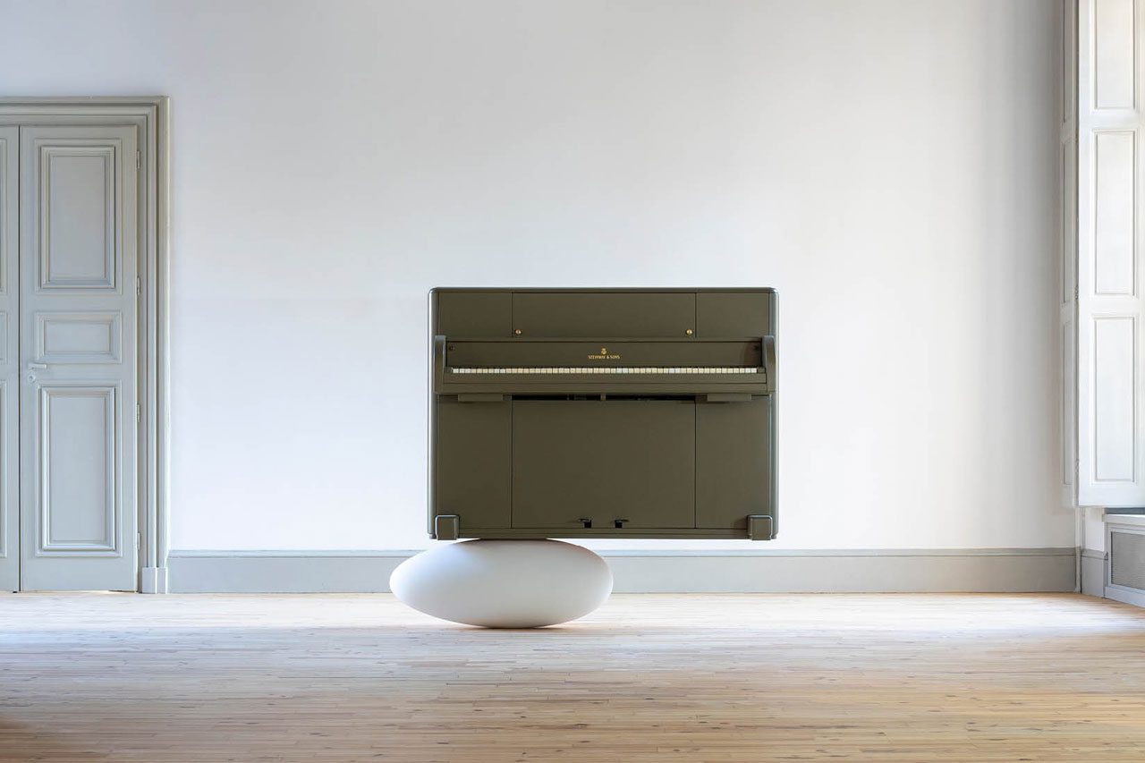 At the center of the exhibition stands a poignant dialogue between two symbols: a “Steinway Victory Vertical” piano from 1944 and a pristine white sculpture reminiscent of a cocoon or egg—an emblem recurring throughout Kiswanson’s oeuvre. The upright piano, parachuted to soldiers during World War II to lift morale amidst devastation, floats delicately above the cocoon-like form. The juxtaposition evokes both solace and rebirth—the piano, once a balm for wartime spirits, now suspended in an otherworldly calm; the cocoon, a vessel of renewal and collective memory. Together, they embody the belief that creation itself holds the power to save, to comfort, to regenerate.