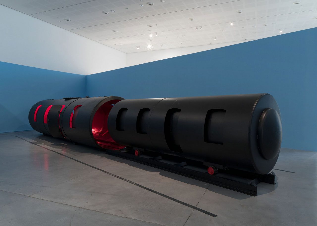 The exhibition opens on the first floor with “Twosome” (1991), a monumental installation in which a small tank moves in and out of a larger one along a mechanical track. This rhythmic motion—endless, cyclical, and slightly ominous—embodies Bourgeois’s recurring meditation on the mother-child relationship. The work’s mechanical repetition transforms a deeply human bond into a hypnotic choreography of separation and return.