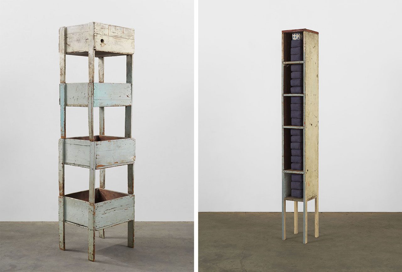 Right: Louise Bourgeois, Untitled, 2000, Painted wood and fabric, 179.1 x 22.9 x 24.8 cm / 70 1/2 x 9 x 9 3/4 in, Photo: Christopher Burke, © The Easton Foundation/VAGA at ARS, NY, Courtesy the Foundation and Hauser & Wirth