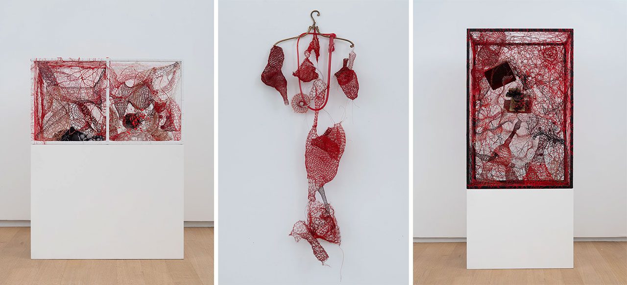 Photo Left: Chiharu Shiota, Inside Memory, 2025 Mixed media, 45 x 45 x 80 cm, 17 3/4 x 17 3/4 x 31 1/2 inches, © Chiharu Shiota, Courtesy the artist and Templon Gallery. Photo Center: Chiharu Shiota, Forgotten Memories, 2025 Mixed media, 135 x 55 x 20 cm, 53 1/4 x 21 3/4 x 7 7/8 inches, © Chiharu Shiota, Courtesy the artist and Templon Gallery. Photo Right: Chiharu Shiota, Inside Memory, 2025 Mixed media, 120 x 80 x 45 cm, 47 1/4 x 31 1/2 x 17 3/4 inches, © Chiharu Shiota, Courtesy the artist and Templon Gallery