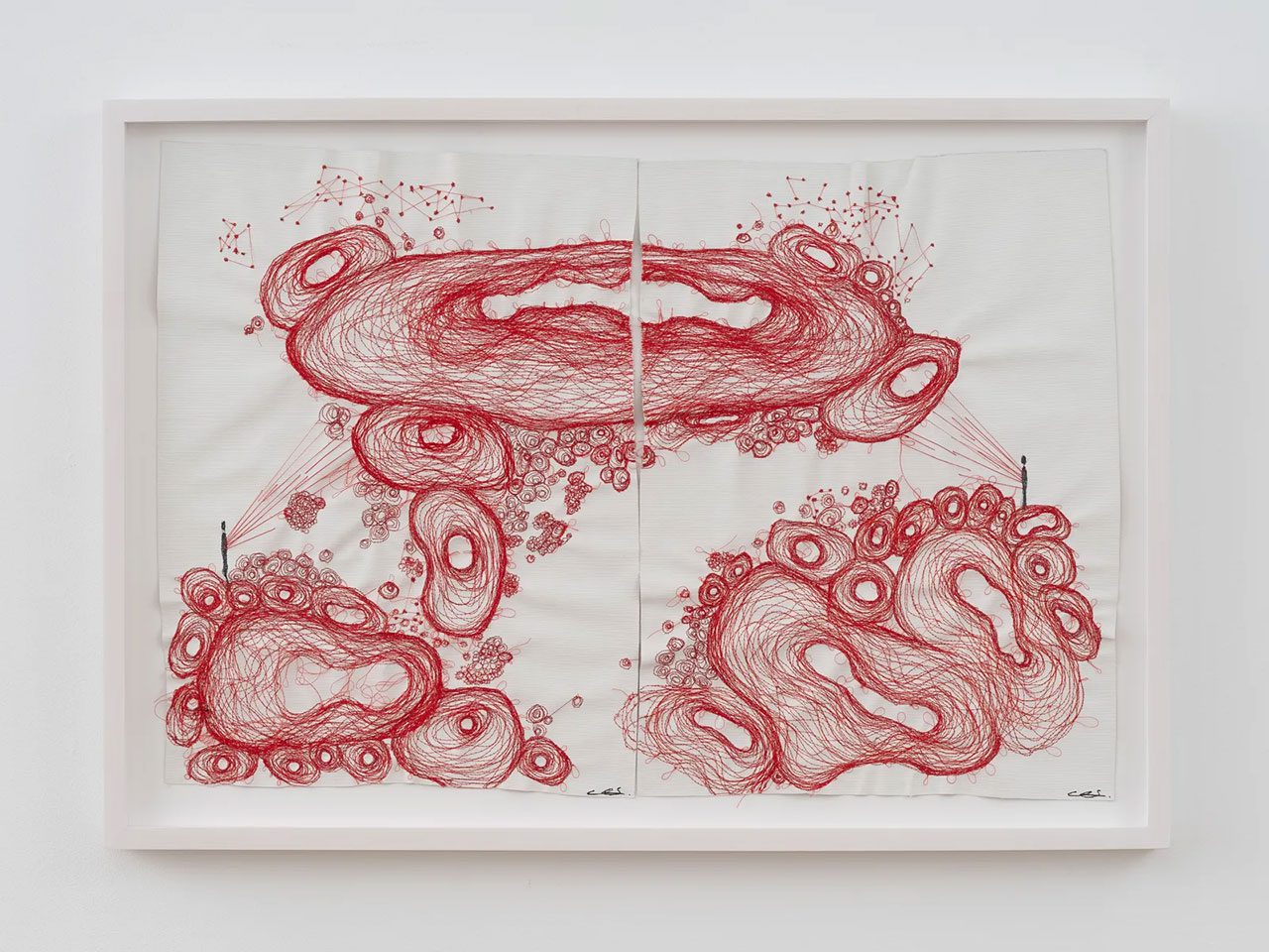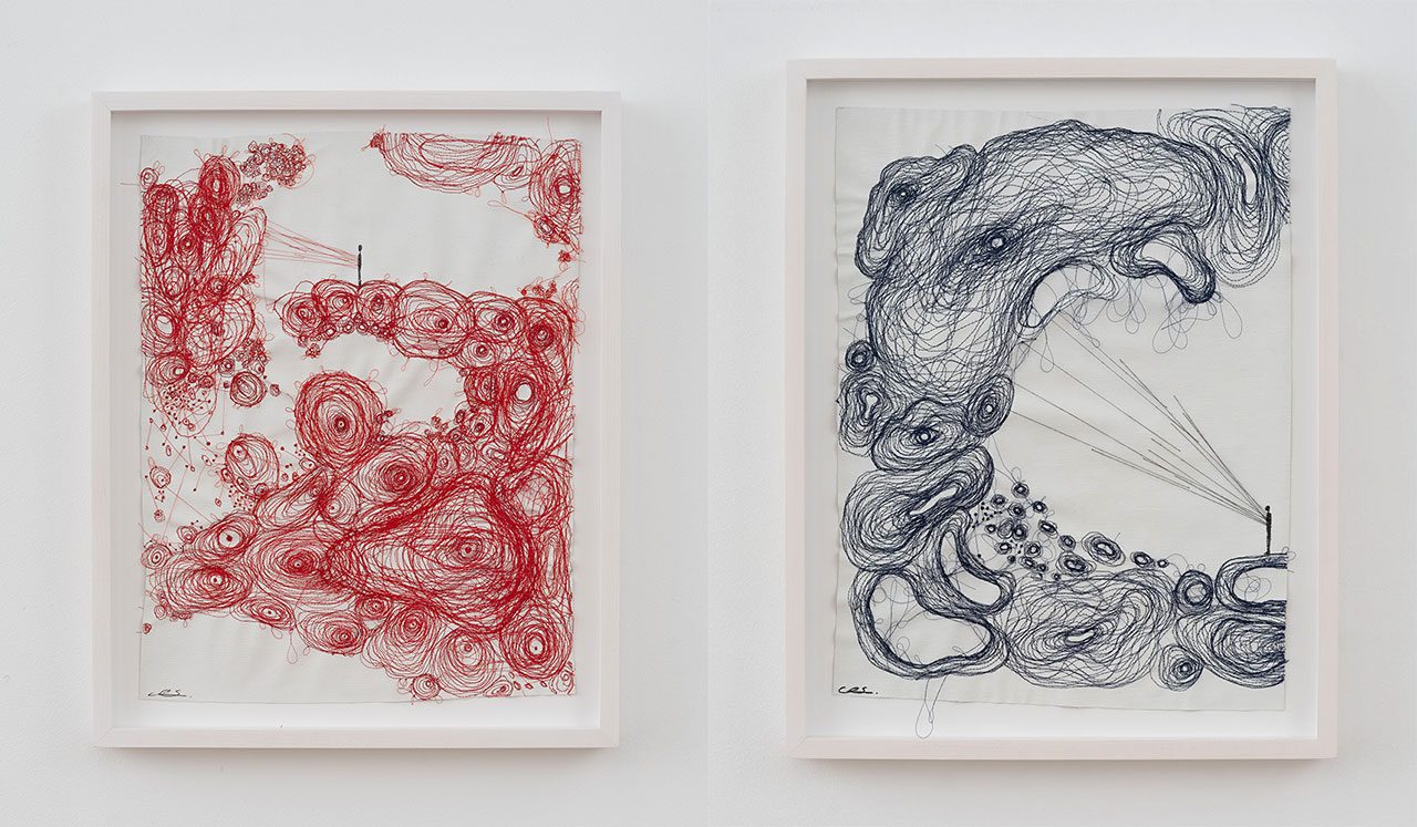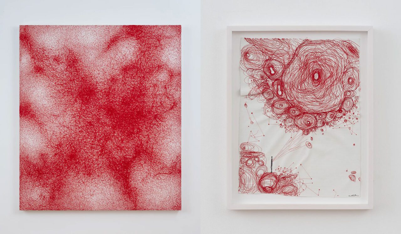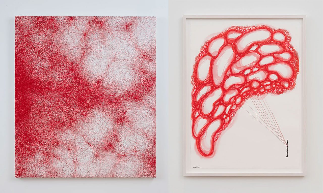 Right: Chiharu Shiota, Connected to the Universe, 2025 Water-soluble wax pastel, ink, and thread on paper, 84 x 63.5 x 2.5 cm, 33 1/8 x 25 x 1 inches, © Chiharu Shiota, Courtesy the artist and Templon Gallery