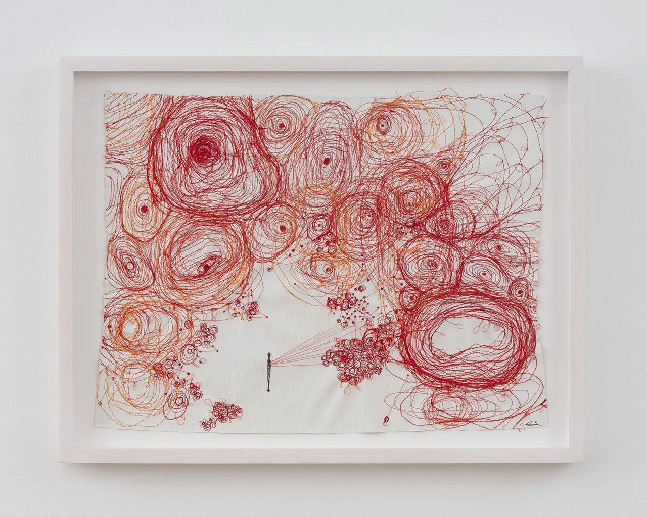 Shiota also continues her exploration through smaller yet no less poignant works—thread-filled boxes that serve as reliquaries of memory, and her “Infinite Lines” canvases, where thread becomes paint, and the web transforms into a delicate skin.