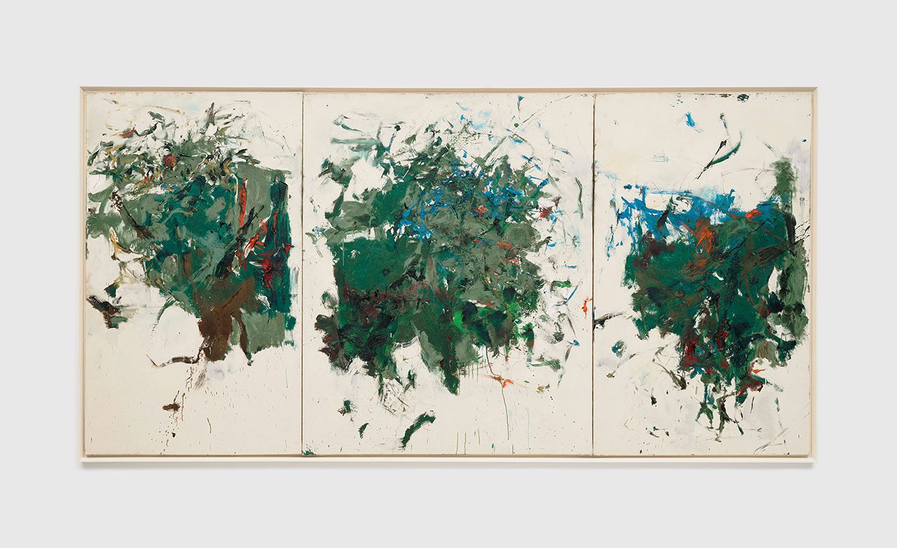 Among the standout works is “Mandres” (c. 1962), a transitional painting that marks Mitchell’s early experimentation with concentrated central forms. The expansive triptych “Untitled” (1963) exemplifies her growing engagement with multi-panel formats, inviting viewers into a panoramic dialogue of movement and mood.