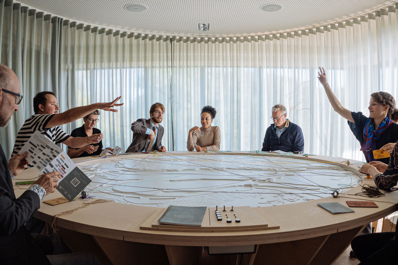 “The Blue Table” is an installation by the architecture firm Office ParkScheerbarth that reflects on the diverse perspectives shaping our built environment. Inspired by the planning of Haus Eins, a proposed high-rise within Berlin’s cooperative cultural village Holzmarkt 25, it functions both as a deconstructed model and a project diary – opening up questions of values, perceptions and psychogeographies in urban development. The circular, two-metre-wide table is populated by twelve stakeholders – abstract stand-ins for real individuals. Around them, one hundred site-specific buildings and objects form a landscape of distorted scales and proximities – a pretzel larger than a building, a disco ball looming overhead – illustrating the symbolic weight different actors attach to the same place. Attendees observe and discuss, moving through shifting viewpoints and translating the relationships they encounter into their own contexts. Rather than presenting a finished vision, “The Blue Table” shifts the focus from singular truth to relational understanding. By combining precise modelling with abstraction and playfulness, it offers an accessible platform that requires no prior knowledge. Visitors are invited to walk around, shift perspectives and encounter the tensions often hidden in planning processes.