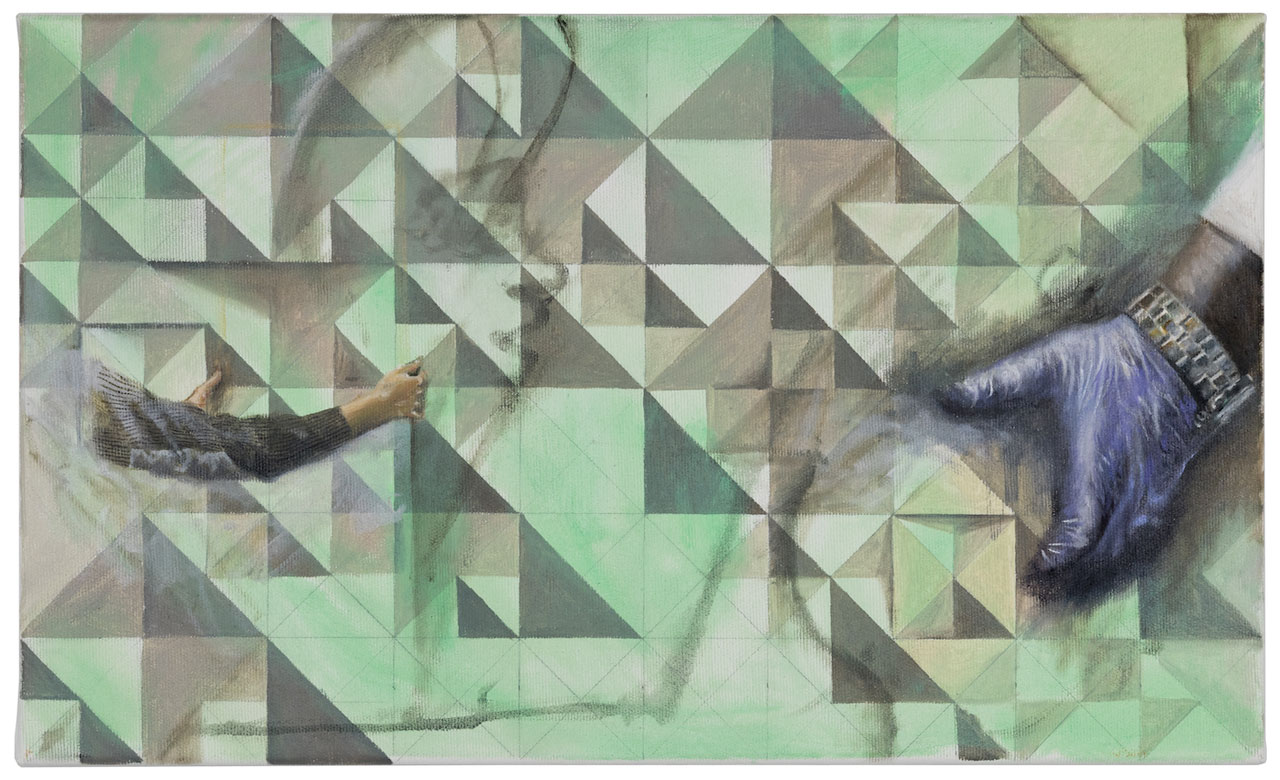Next, the painting “Untitled (handling)” by Alison Yip shows two sets of hands handling objects that fade into the background. One can clearly see that the hands are holding something, yet what exactly this is remains concealed from the viewer. Through the differing perspectives on the hands, it becomes evi- dent that they must be situated in different contexts, brought together in a single moment within the canvas. Even though we are not seeing the full situation we add the remaining pieces, in this case the artworks to explain the situation we are seeing. This is only possible through the memories we collected and can clearly differ to another viewer.