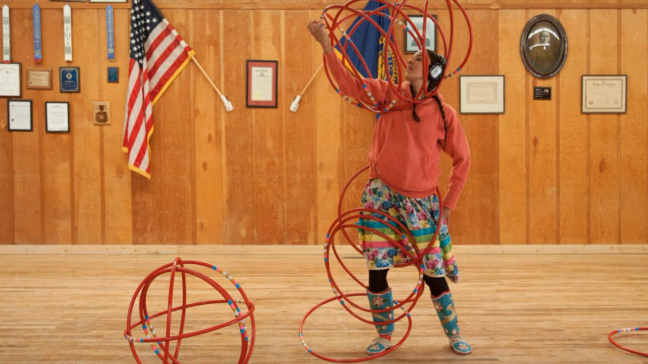 Perhaps the most vivid expression of the film’s choreography emerges when the Engraver leaves the wilderness and encounters the Hoop Dancer—Sandra Lamouche of the Bigstone Cree Nation—performing inside an American Legion hall. Her presence introduces a cultural and historical dimension that expands the work beyond its mythological frame, gesturing toward Indigenous embodied traditions and their coexistence (and often friction) with settler narratives of land and wilderness.