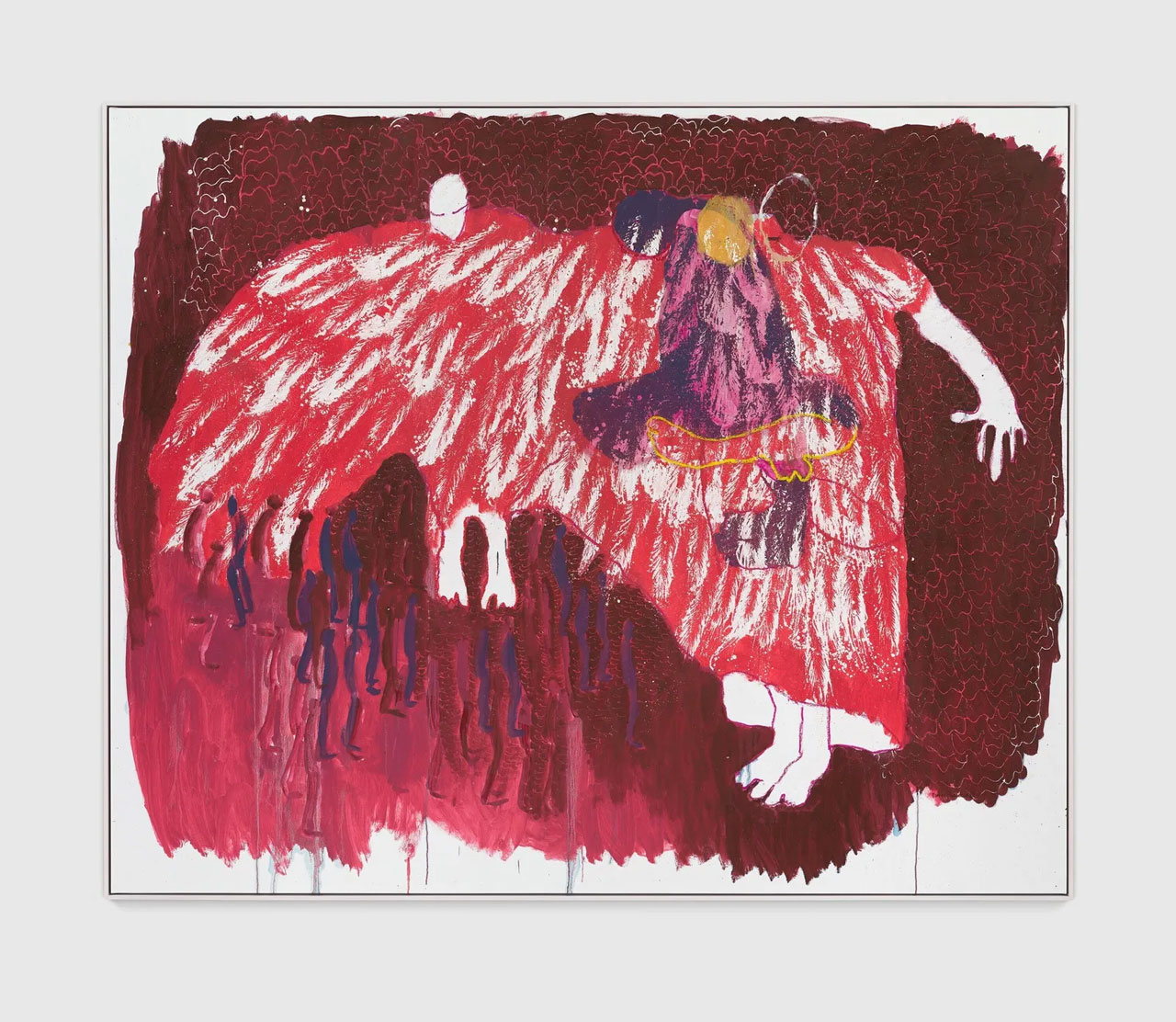 Photo: Portia Zvavahera, Kubudiswa (redeemed), 2025, Oil based printing ink and oil bar on linen, 105 3/8 x 165 1/4 inches (267.7 x 419.6 cm), Framed: 106 5/8 x 166 3/8 inches (270.7 x 422.6 cm), Signed and dated recto, © Portia Zvavahera, Courtesy the artist and David Zwirner Gallery