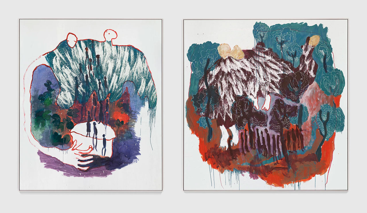 The exhibition “Zvibereko zvemweya wangu” features a series of new works that continues to develop Portia Zvavahera’s experiments with different painting processes and subject matter by joining her carefully charted dream worlds with her lived experience and daily rituals. Zvavahera expands her practice with familiar motifs and narratives; her works are populated by symbolic creatures that become powerful conduits for the interpretation of spiritual visions and the contemplation of our earthly existence.