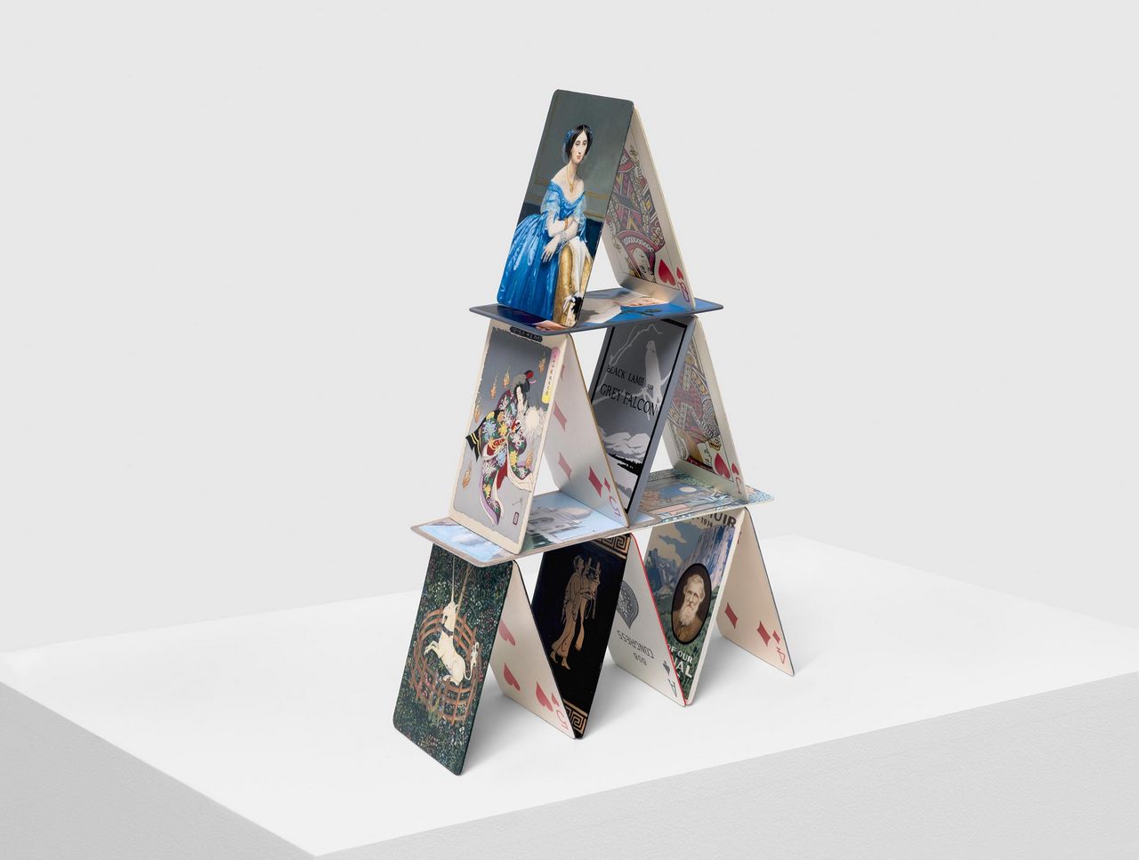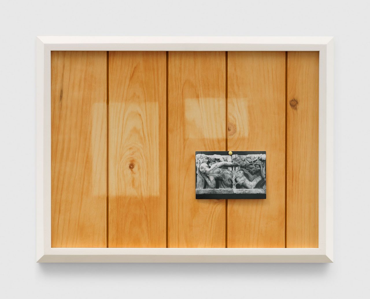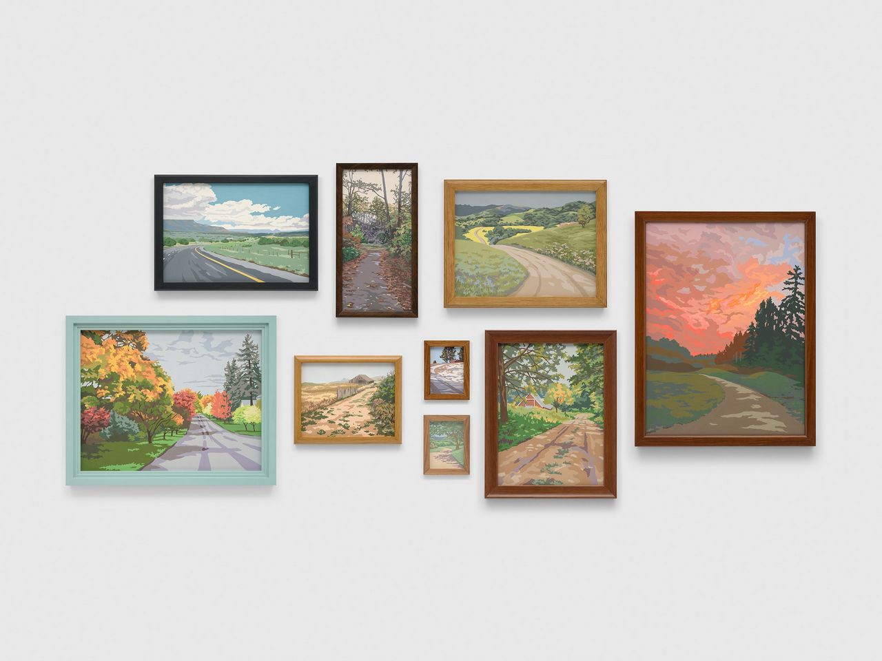 Also on view are examples from Biernoff’s recent body of large-format multimedia compositions that explore the rich historical tradition of the trompe l’oeil. Inspired by vintage paint-by-number sets, the multipart “Road Not Taken” (2024) comprises nine sculptural paintings of bucolic open roads that are based on photographs shot by the artist and her friends and family. While nodding to the pleasant, nostalgic aesthetic and commercial kitsch of the scenes found in these do-it-yourself paintings, the work also draws a parallel between the democratization of imagemaking proffered by both these craft kits and the medium of home photography. Other works in the show take the form of delicately painted assemblages, such as “Fragment” (2024), in which a painted postcard of a twelfth-century stone carving is affixed to a faux wood panel using a handmade ceramic pushpin; the artist includes faded rectangles in her painted rendition of the wood surface, suggesting the existence of other images that are lost yet might one day be rediscovered. Exploring the slippage that occurs between the experience of reality and the memories that remain after the fact, Biernoff’s poignant and visually captivating paintings serve as, in the artist’s words, “reservoirs of time.”