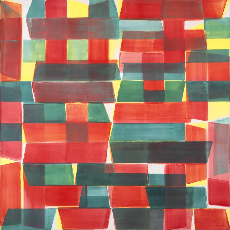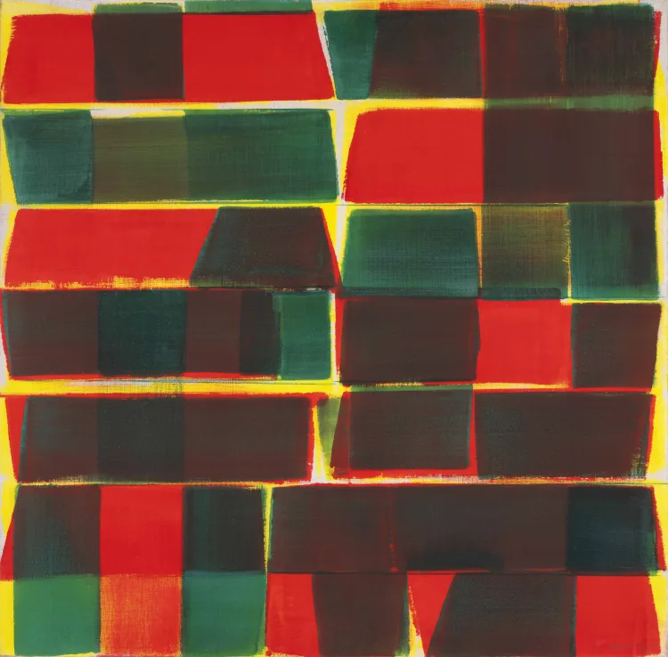 His quest for harmony leads him to place geometric forms at the core of his oeuvre, not as simple ornaments, but as profound symbols. The Shri Yantra, sacred emblem of Hinduism, is reinvented in each of his creations, its geometry simplified into almost calligraphic writing. Each line, each space evokes the balance of opposites, revealing the mysteries of the cosmos and of the human soul. From the 1990s onwards, he undertook a radical purification of his forms, exploring color like a spiritual language. By exclusively using green, yellow and red, black and white (colors of the kalamezhuthus), the forms carry a deeper meaning. This return to the essence is accompanied by the use of casein, which enables him to play with light and transparency, adding a new dimension to the material.