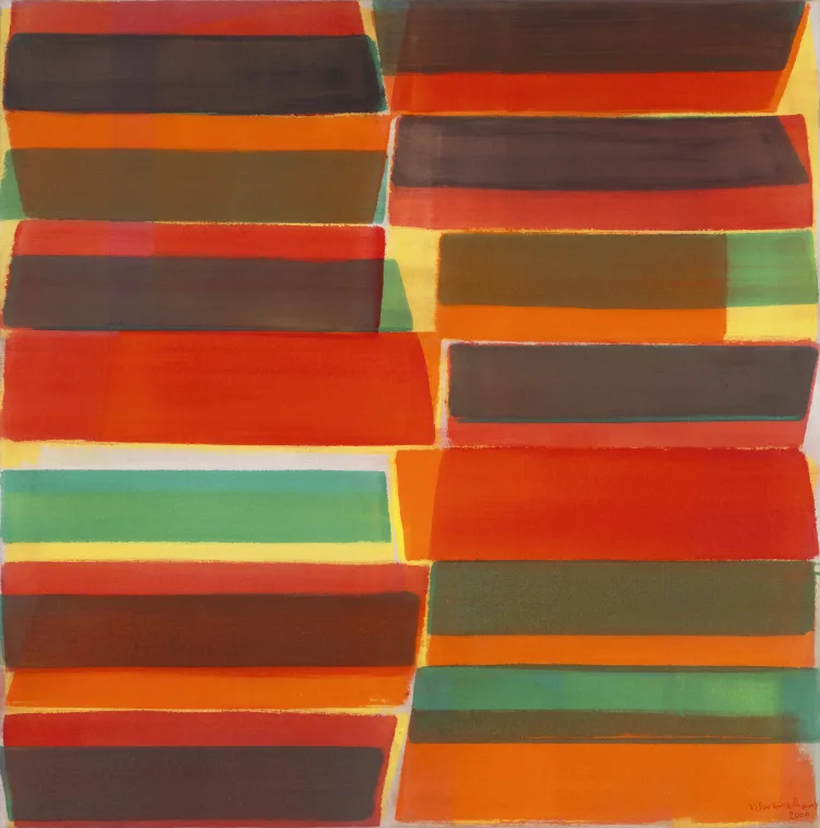 Born in 1940 in Kadavoor, in Kerala, Viswanadhan grew up in an environment steeped in culture and spirituality, influenced by the traditions of the Vishwakarma caste of craftsmen, architects, painters and sculptors. It is in this context that, as a child, he was introduced to the sculpting of idols and to mandalas, the sacred geometric figures used in Hindu and Tantric rituals. These early explorations of color, form and symbols would leave a lasting mark on his oeuvre, manifesting themselves throughout his career as echoes of his Indian roots.