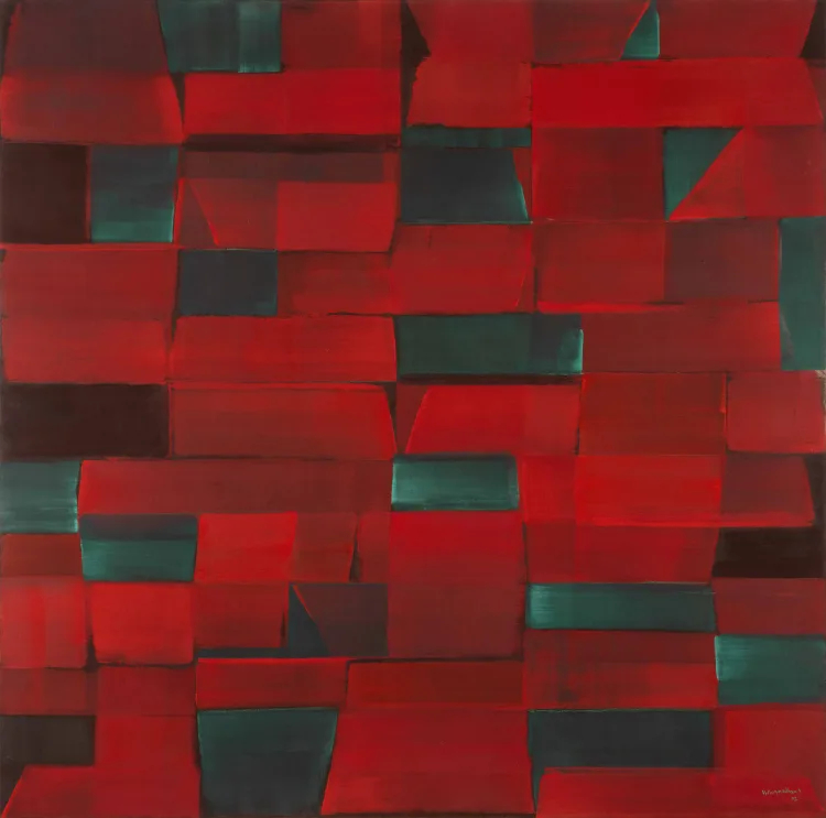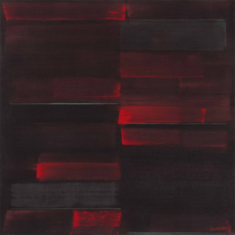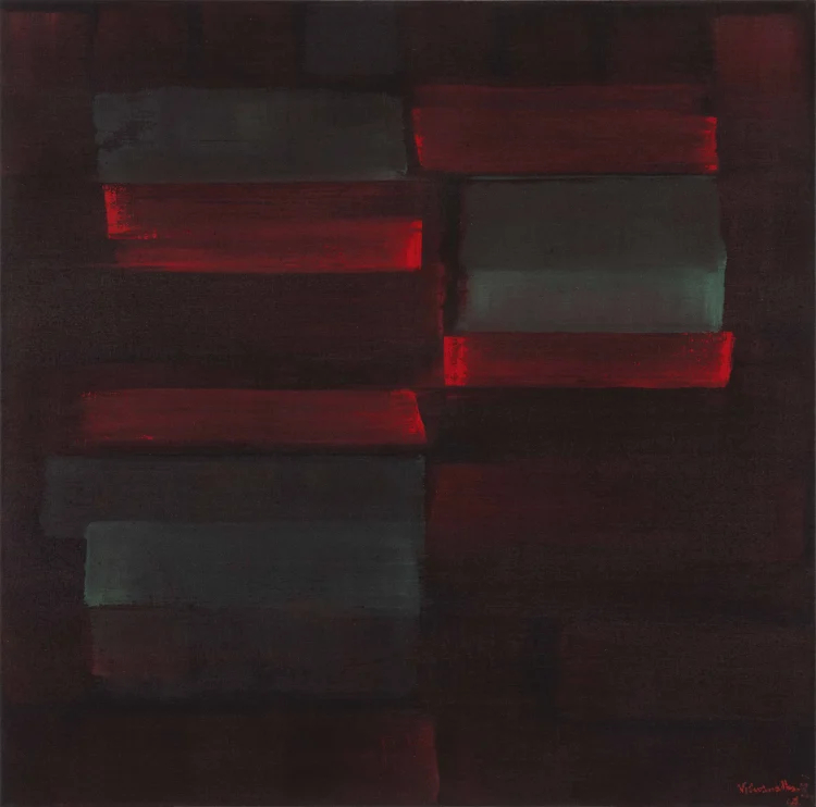 Trained at the Government College of Arts and Crafts in Madras (now Chennai), Viswanadhan discovered the fundamental principles of Western art. Unlike the Bombay school, which drew directly on these influences, the schools of Madras and Calcutta adopted a more syncretic approach, seeking to marry Eastern and Western aesthetic traditions without denying their own heritage. This is how Viswanadhan came into contact very early on with the international scene, notably through the exhibition “Two Decades of American Painting”, organized by Clement Greenberg in New Delhi, in 1967. On this occasion, he was first exposed to works by Mark Rothko, Jackson Pollock and Sam Francis, who left their mark on him. However, far from limiting himself to a mere appropriation of Western trends, Viswanadhan chose to transcend them by reconnecting with the primal gesture of his childhood and establishing a genuine dialogue with his origins.
