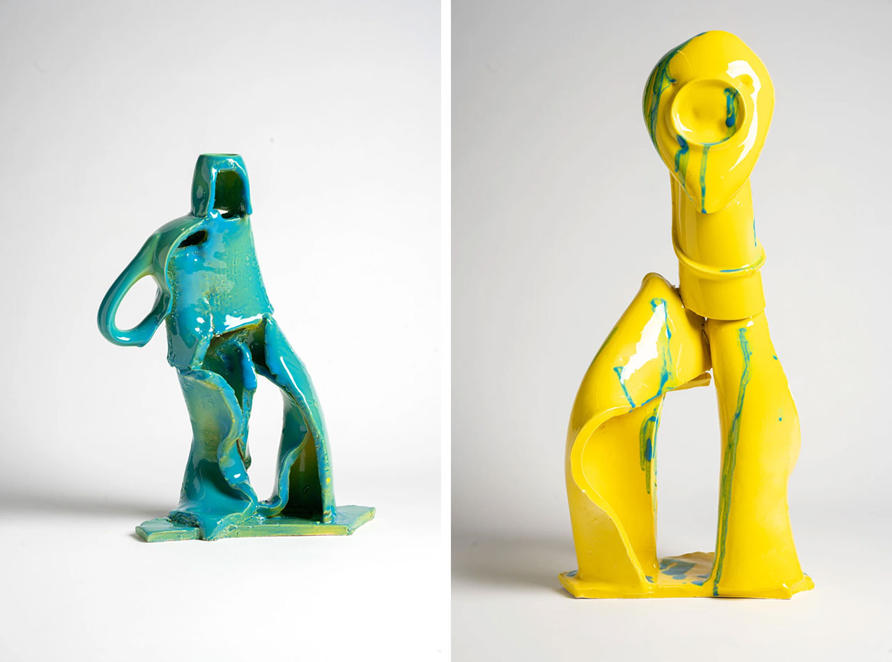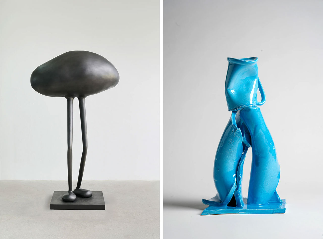 Right: Erwin Wurm, Idol, Looking Back, 2025, Ceramic, glaze, 42 × 24 × 17 cm (16.54 × 9.45 × 6.69 in), © Erwin Wurm, Courtesy the artist and Thaddaeus Ropac Gallery