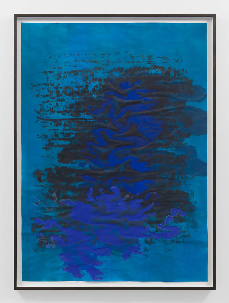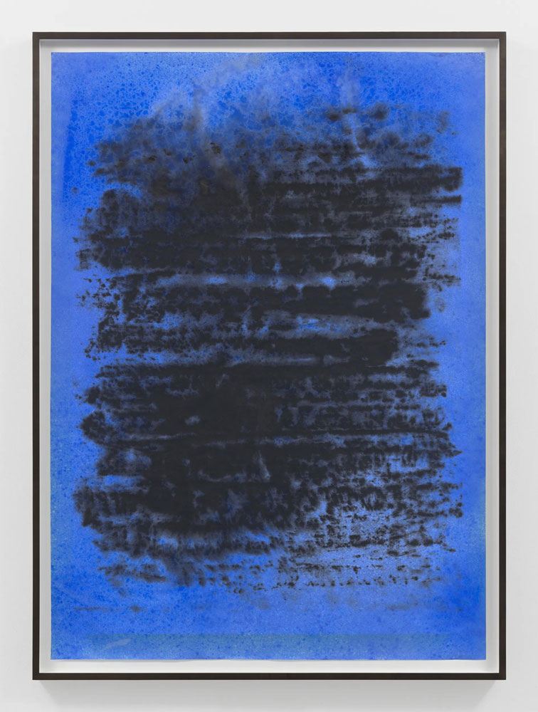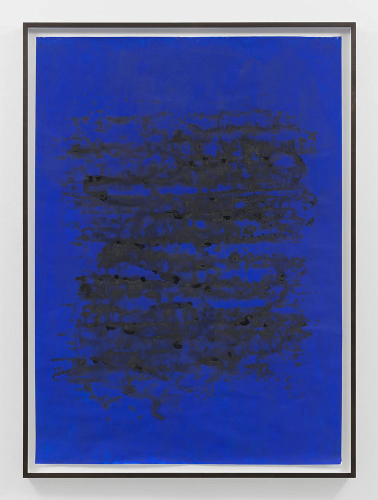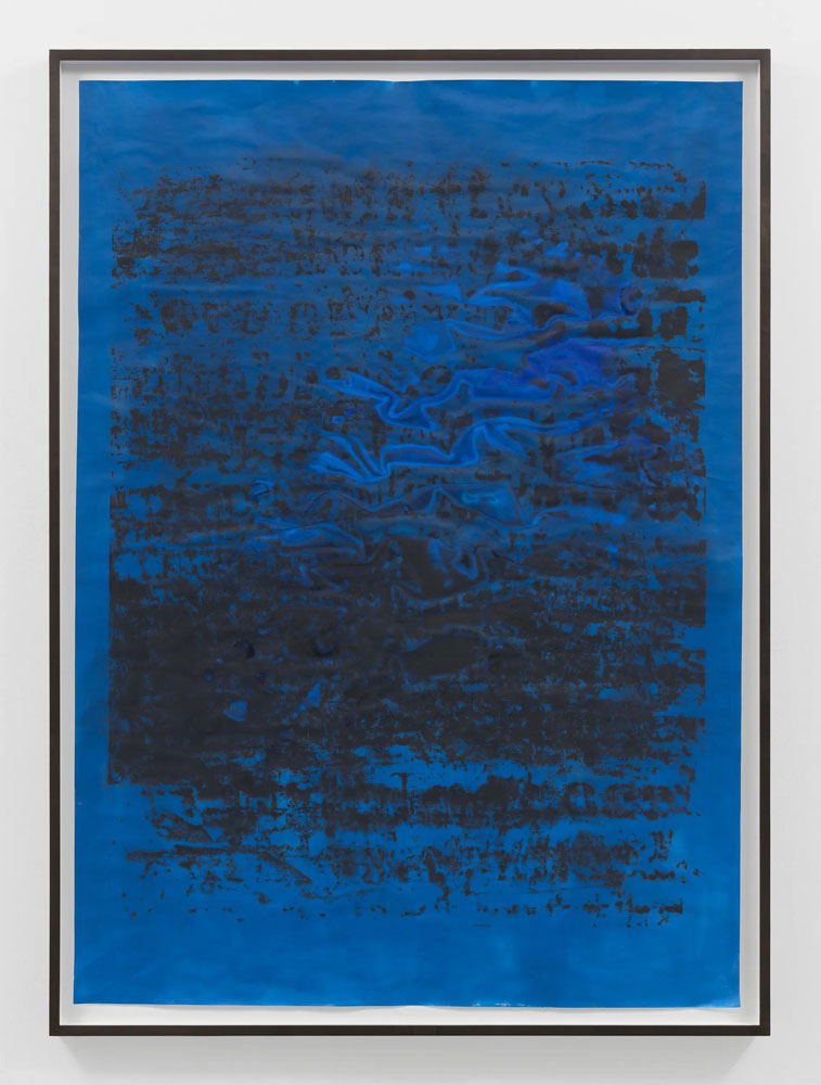 “Late at night, early in the morning, at noon” is a two-part exhibition of new and historic works on paper by Glenn Ligon. This presentation extends the artist’s longstanding engagement with language and abstraction through a series of richly layered compositions that meditate on the color blue and its emotional, historical and cultural inflections. In dialogue with the writings of James Baldwin, Ligon’s latest work here traverses the space between legibility and sensation, where text dissolves into atmosphere and meaning into light.