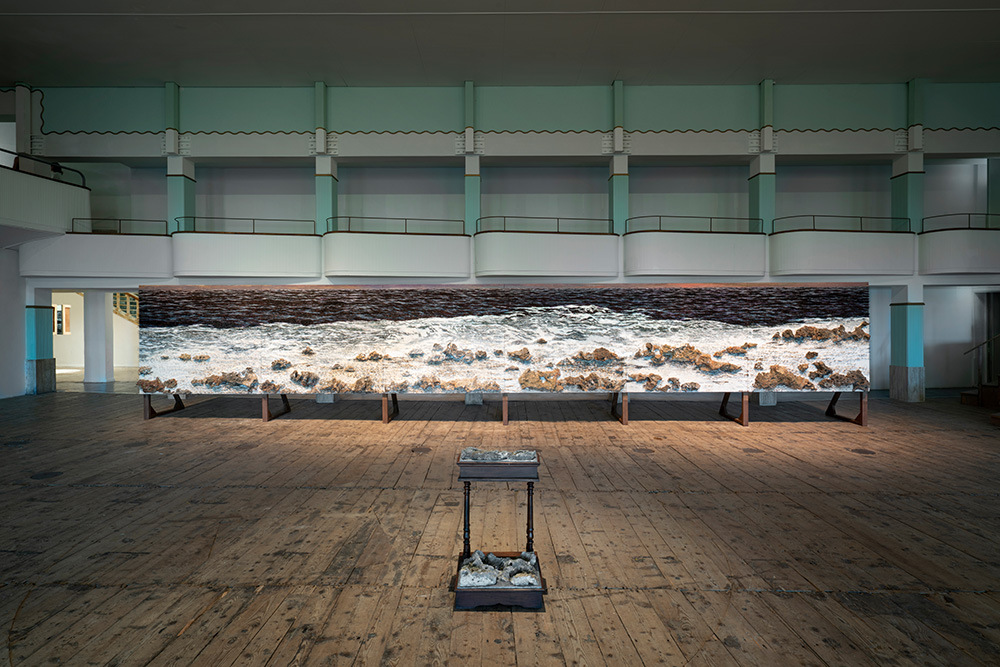 Formally, these works, with their diminished horizon, visually reference Monet’s iconic water lilies. But symbolically, no flowers appear here; where Monet painted delicate water lilies floating on water, Capote affixes heavy, sharp reef stones alongside sea imagery. This ironic artistic choice contrasts Monet’s idyllic scenes with Capote’s portrayal of the drama, hardship, and pain experienced by those confronting their reality and geography.