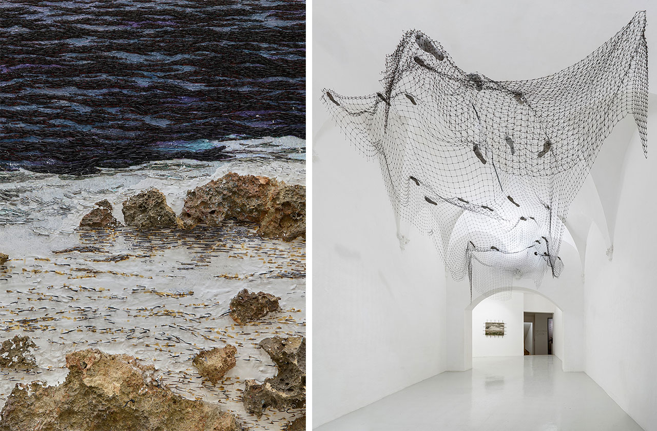 “Ruido Blanco” also features works from the well-known series “Islas” and “Purificación”. “Islas” recreates seascapes using oil paint and fishhooks, while “Purificación” repurposes chains, barbed wire, handcuffs, and other metal debris into new forms that express deconstruction, tension, aggression, and control. The creative process behind these works is documented in a video shown at the gallery, offering powerful insight into their meaning. Additionally, the show includes recent and earlier installations and sculptures, as well as drawings from the series “Sentimientos encontrados”, based on electrocardiograms collected by the artist from various Cubans, expressing the fragmentation of Cuban society caused by grief and frustration.