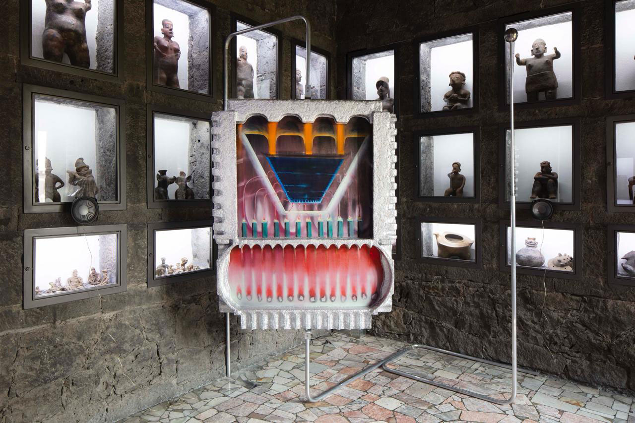 Right: Anicka Yi. Archaic Cusp. 2023. Kelp, aquazol, glycerin, crepeline, acrylic, LED and animatronic insect. 153 x 70.5 x 70.5 cm. Tanoto Family Collection. Courtesy of the artist and Gladstone Gallery