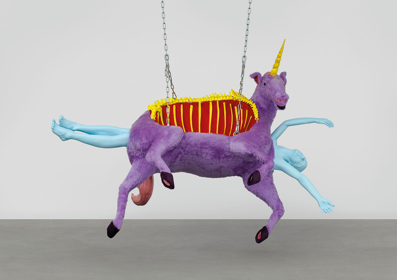 Simnett’s iconography draws deeply from Greek mythology and a global constellation of fairy tales and folkloric traditions — yet she does not simply retell ancient narratives. Instead, she transfigures them. Goddesses, demons, witches, and female-coded figures are unraveled and knit together into hybrid bodies and identities that defy simple categorization. These figures inhabit states of transformation — caught between pleasure and pain, power and vulnerability, life and death. While myth provides the structural grammar, Simnett superimposes her own contemporary lexicon: AI-generated forms, mechanized gestures, and reflections on algorithmic perception that foreground a post-human sensibility.