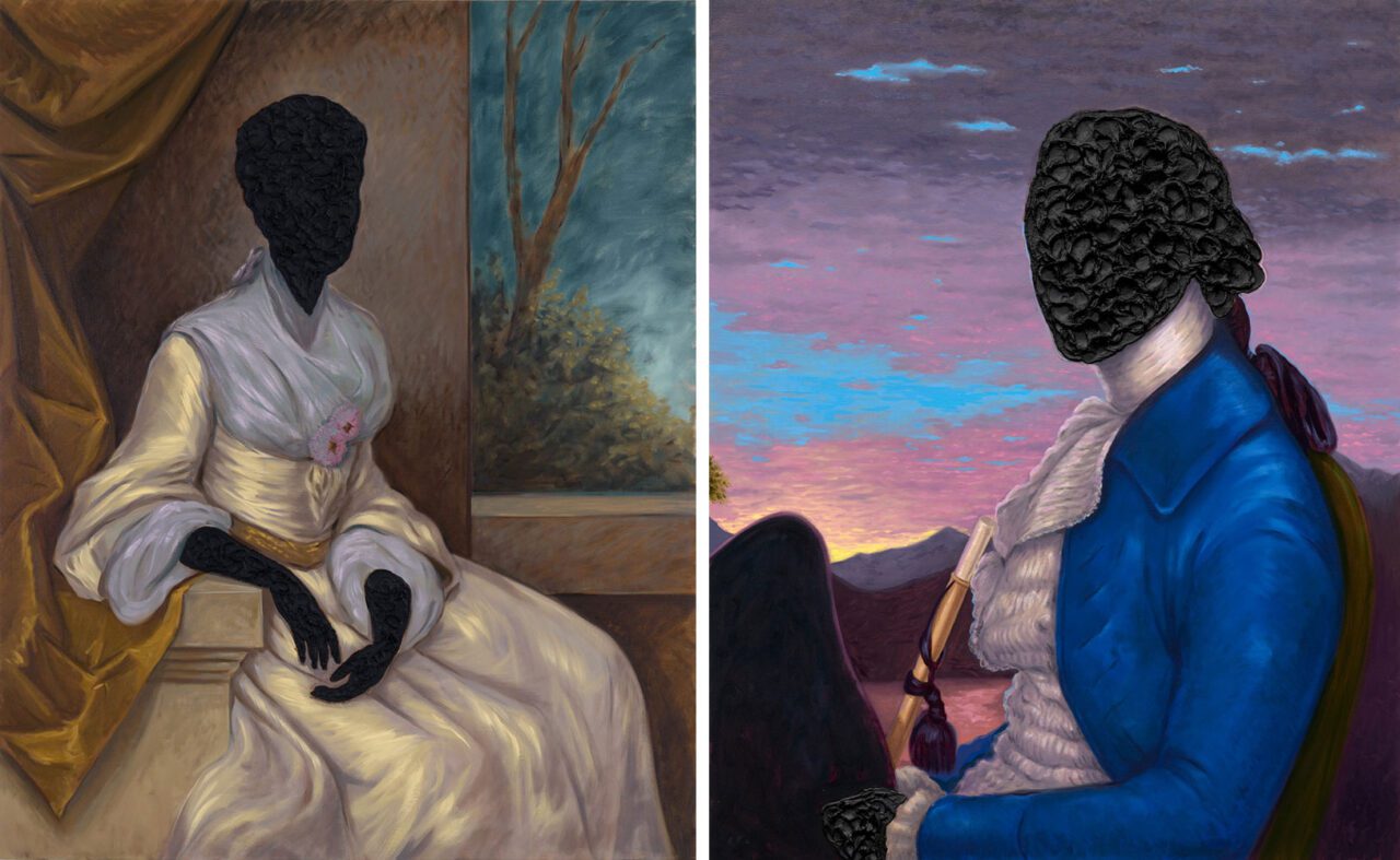 In several recent canvases, the artist extends the visual logic of his acclaimed “Tar” (2012–) and “Whitewash” (2013–) series, advancing the formal dialogue that anchors his work. These paintings depict individuals connected to the founding era of the United States—people who lived in the orbit of early presidents but were systematically erased from the historical record. Many are enslaved people linked to George Washington—household staff, Revolutionary War participants, and women whose stories are only now emerging through renewed scholarship. By asserting their presence on canvas, Kaphar restores agency and dignity to figures once relegated to absence.