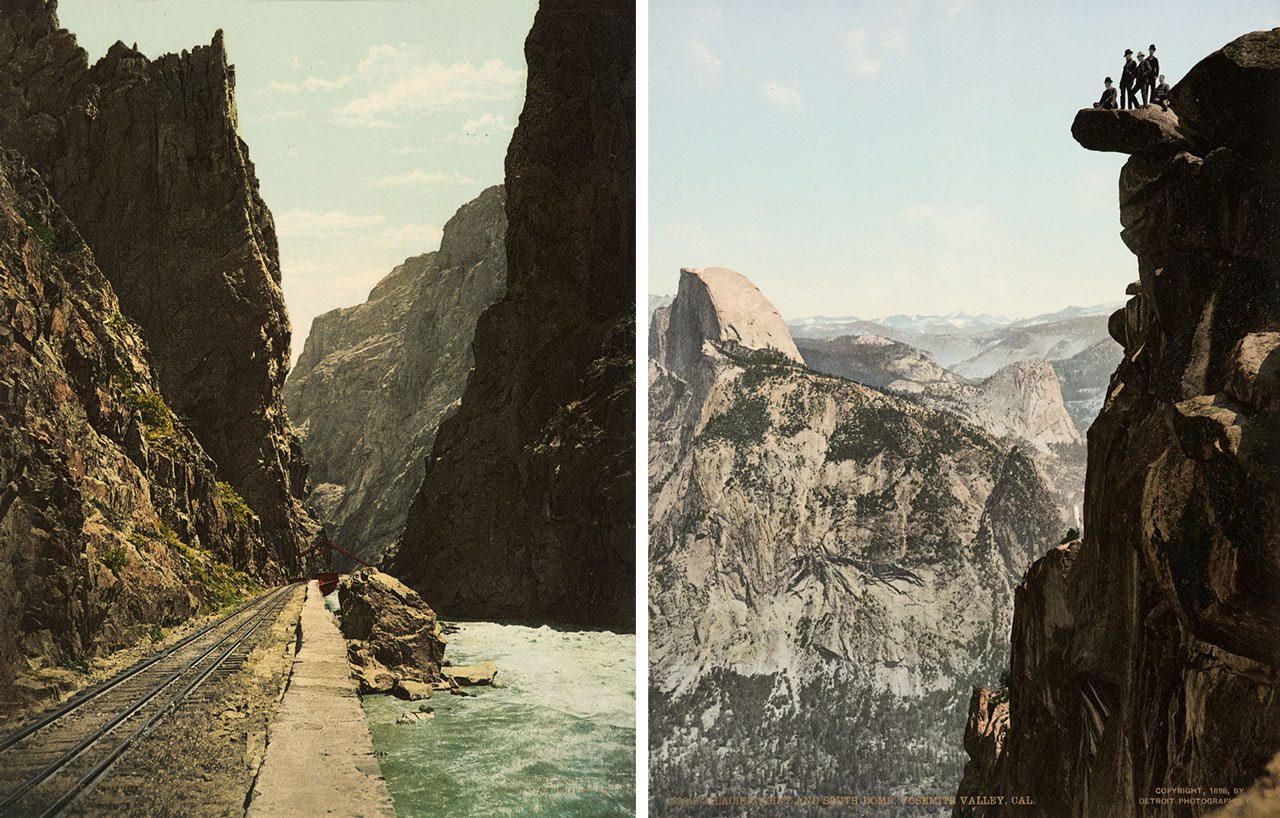 Right: Detroit Publishing Company / William Henry Jackson, View from Glacier Point of the South Dome, or Half Dome, Yosemite Valley, California, 1898, Peoples: Me-Wuk (Southern Sierra Miwok), Nüümü (Northern Paiute), Miwok, Me-Wuk (Miwok) place name: Yohhe’meti (“Those Who Kill”), Photochrom, Museum Ludwig, Cologne, Reproduction: Historical Archive of the City of Cologne with Rhenish Photo Archive