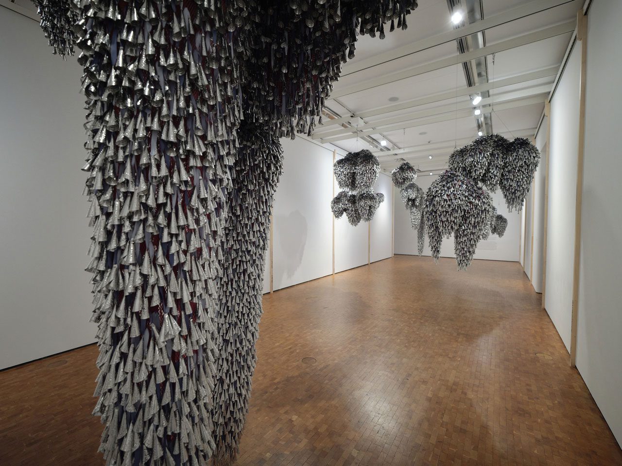 If Red Star interrogates representation through the photographic image, Marie Watt addresses memory through material, sound, and embodied experience. Born in Seattle in 1967, a member of the Seneca Nation, and based in Portland, Watt is known for large-scale installations that weave personal, communal, and historical narratives into spatial form. For Museum Ludwig she created Thirteen Moons, an expansive installation of thirteen suspended sculptures composed of tin jingles. The work inhabits the gallery as a tactile and sonic environment: the elements only sound when touched or set in motion, producing a subtle, shifting field of metallic resonance.