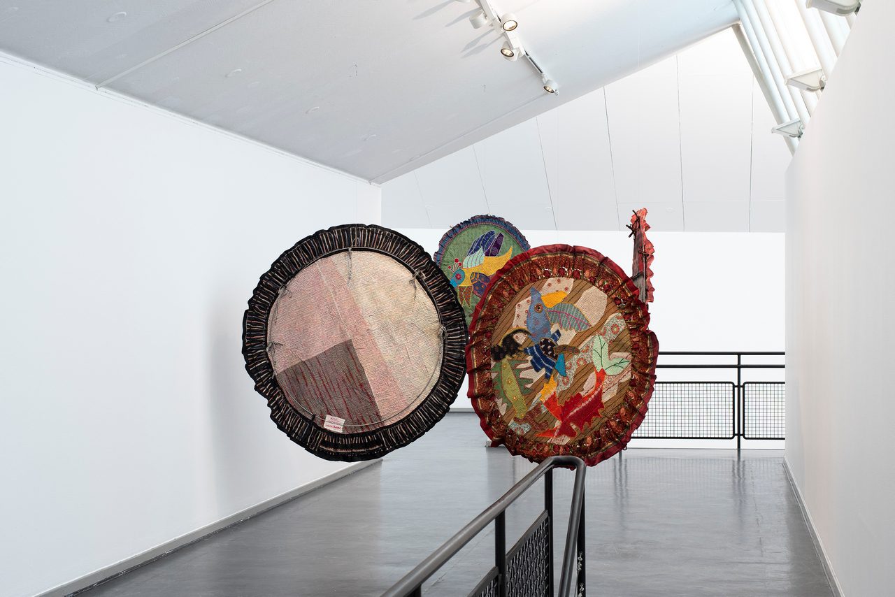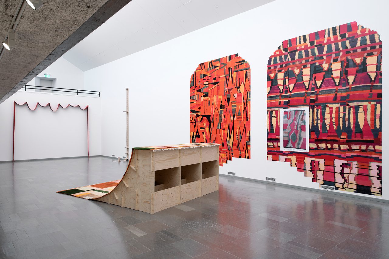“Soft Logic” moves across temporal and geographic strata. One installation traces Tensta’s long history—from medieval settlement to modern housing programs—through layered carpets cut with abstract patterns. Fabric bearing folds and traces of previous use foregrounds textile as a universal everyday gesture, while ceremonial textiles prompt questions about ritual in contemporary contexts, including the need to express queer community.