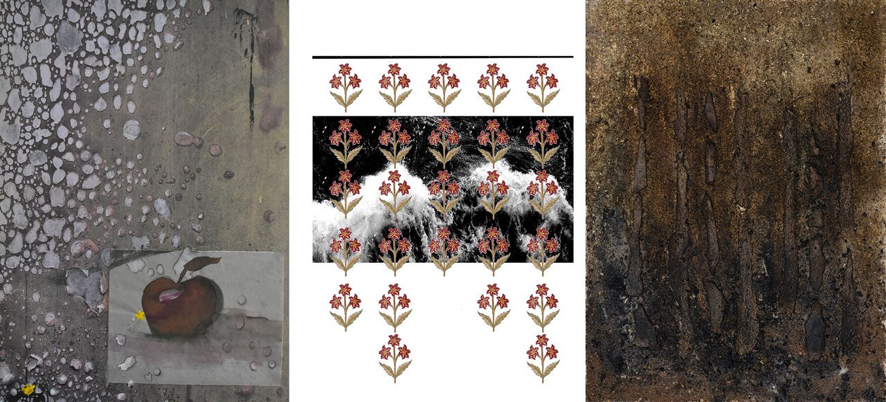 Right: Theodosia Papadopoulou, Forest, Soil, charcoal, wood bark, prickly pear leaf mesh, sawdust, ash — materials burned with fire, on cardboard