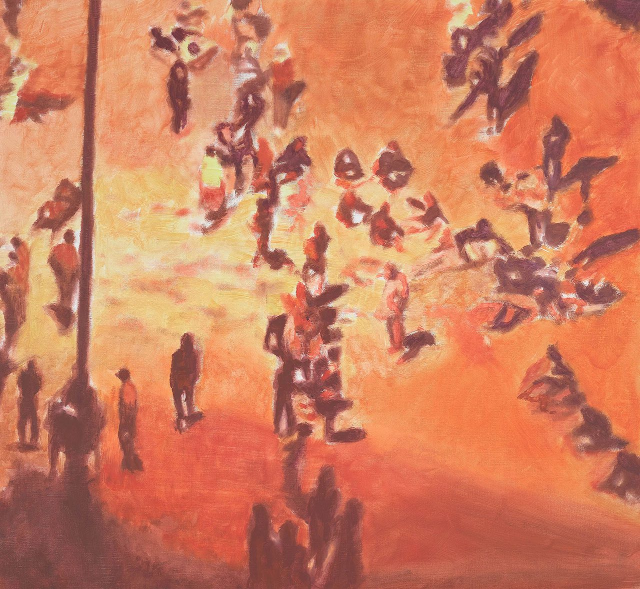 “Migrants” (2025) diverges in one crucial respect: it is the only work derived from an unmanipulated news photograph. Painted in urgent reds and oranges with comparatively loose handling, the image resolves only from a distance. Dozens of shadowed, faceless figures—waiting at a border—materialize as a collective presence. Here, mediation is not digitally compounded; instead, painterly translation underscores the instability between document and interpretation.