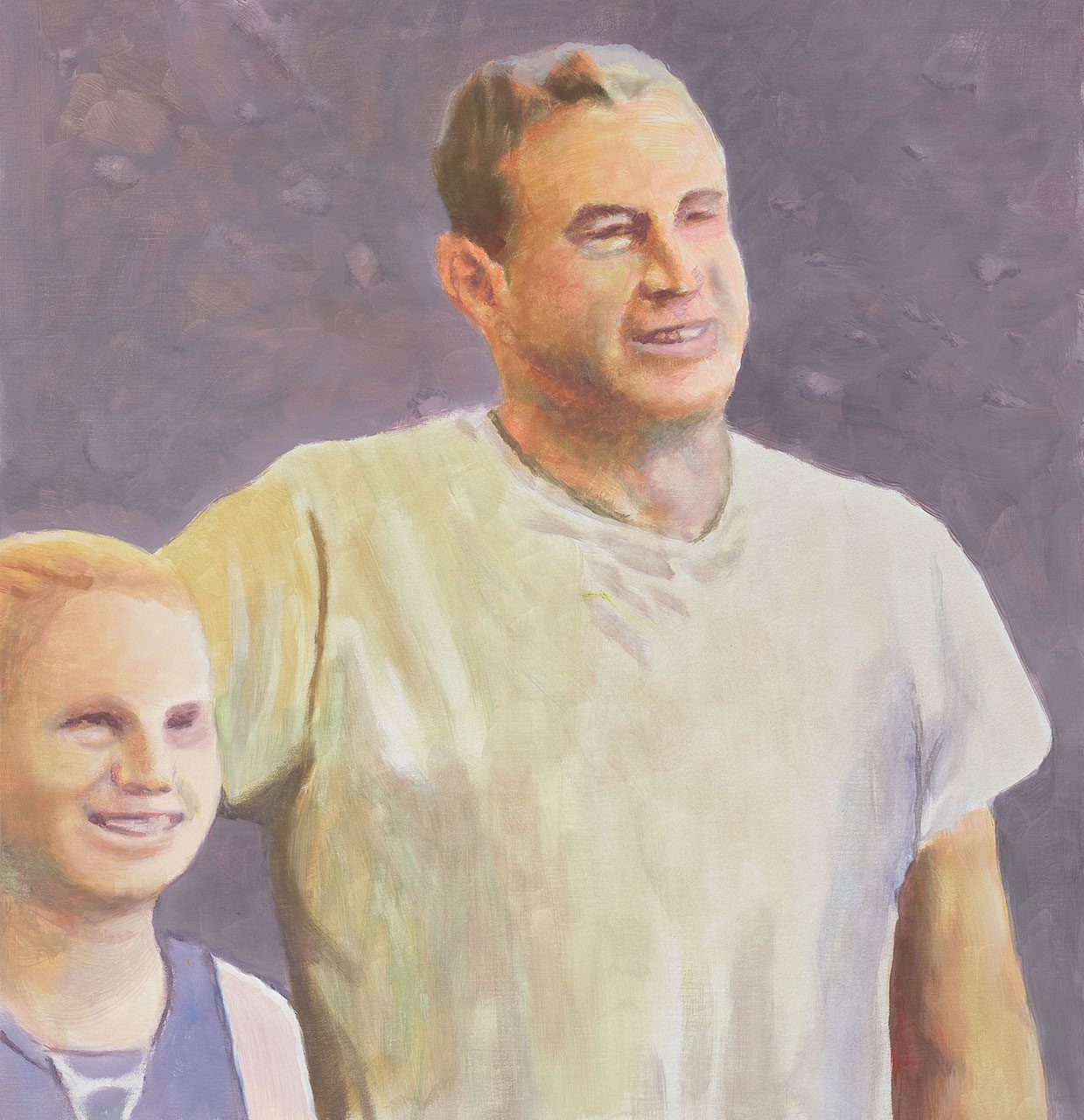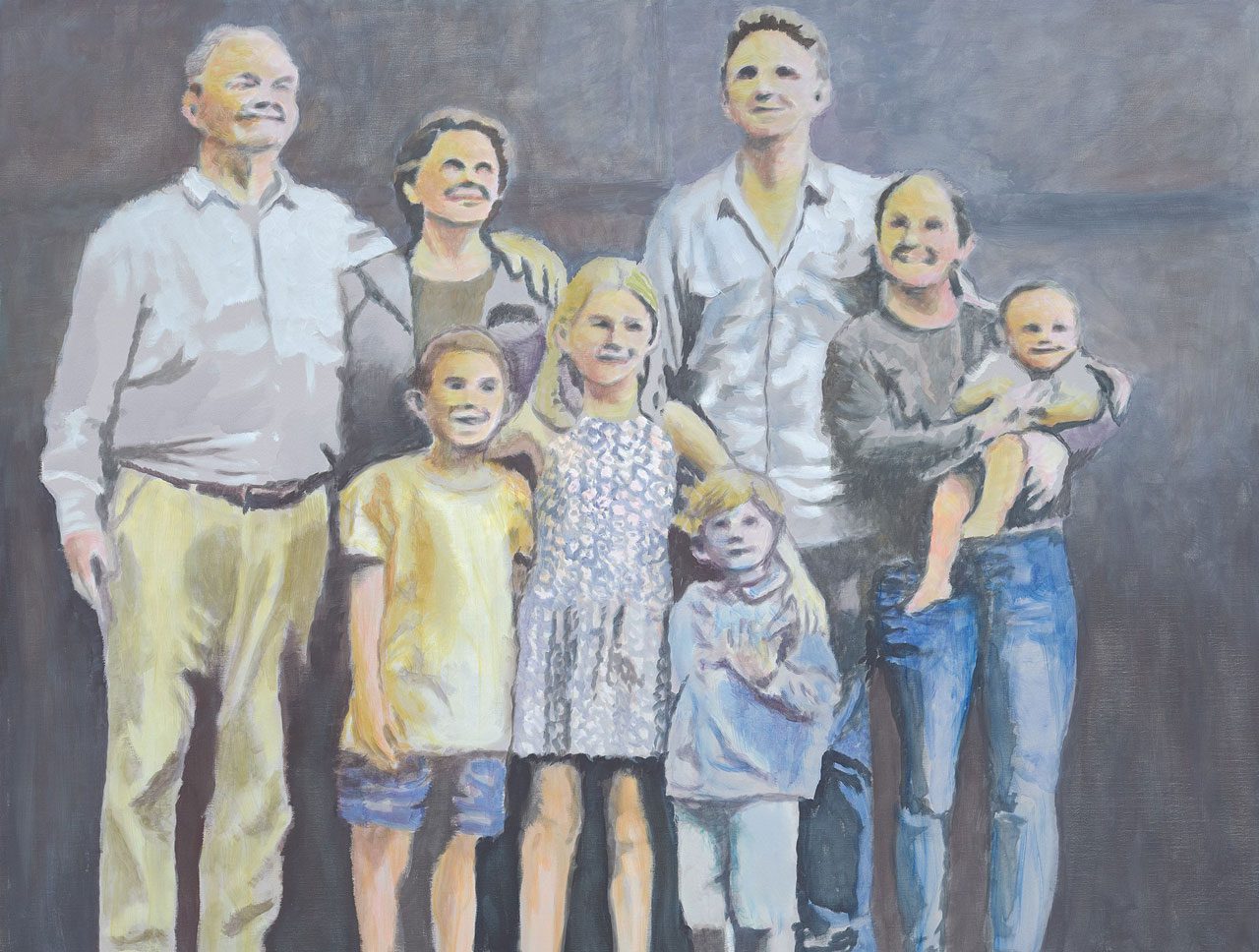 In “Hall of Fame” (2025), a figure wearing the yellow NFL Hall of Fame jacket cradles a football while staring vacantly forward—a champion emblematic of a national pastime, yet curiously emptied of triumph. “The Family” (2025) presents three generations smiling in close formation. Their brightness recedes even as we register it, underscoring the fragility—perhaps impossibility—of a stable, shared reality.