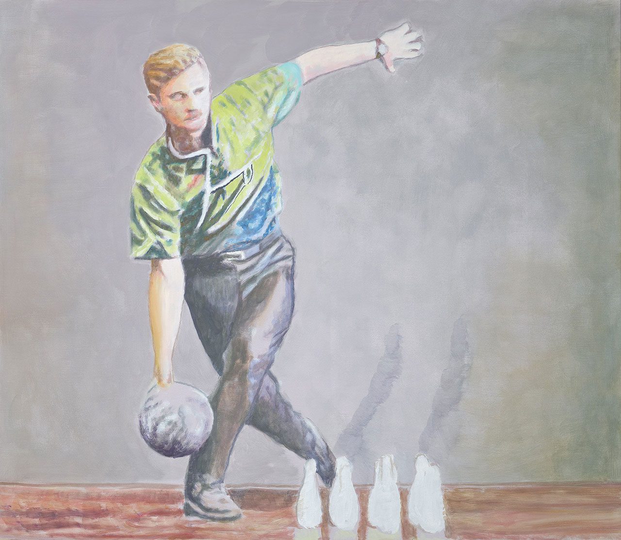 Rendered on a more intimate scale, the works invite face-to-face confrontation. Yet optimism is undercut by material decisions: an ashen underlayer and thin paint application produce a spectral effect, as though vitality were never fully present.