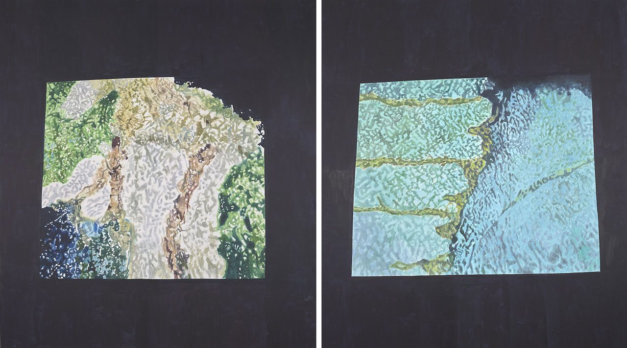 Each composition is encased in thick, nearly black borders—achieved without black pigment—that occupy nearly as much surface area as the central “image.” These off-square frames intensify the perception of internal luminosity while foregrounding containment. The paintings oscillate between abstraction and representation, opening onto unstable readings that mirror the mutability of historical memory.