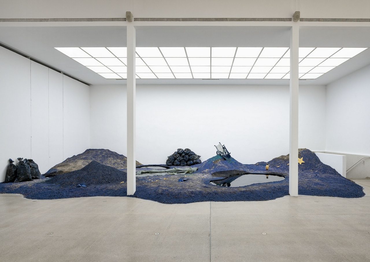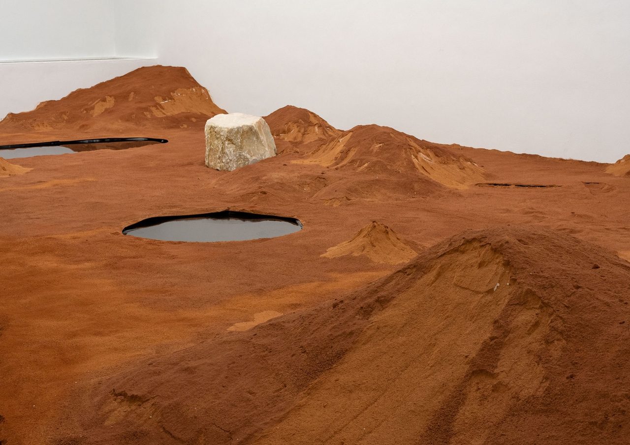 Encircling this central form is a landscape of artificial topographies in white, red and blue — hues that operate as condensed signifiers. White alludes to white hegemony, kaolin and sand; red references the distinctive soil of Dike’s southeastern Nigerian homeland; and blue evokes cobalt mining sites in the Democratic Republic of the Congo, where young people, women and children engage in hazardous labor to supply minerals for global technology markets. These colours also gesture toward the national identities of major mining investors, implicating Global North states and China in the ongoing circuits of extraction and inequality.