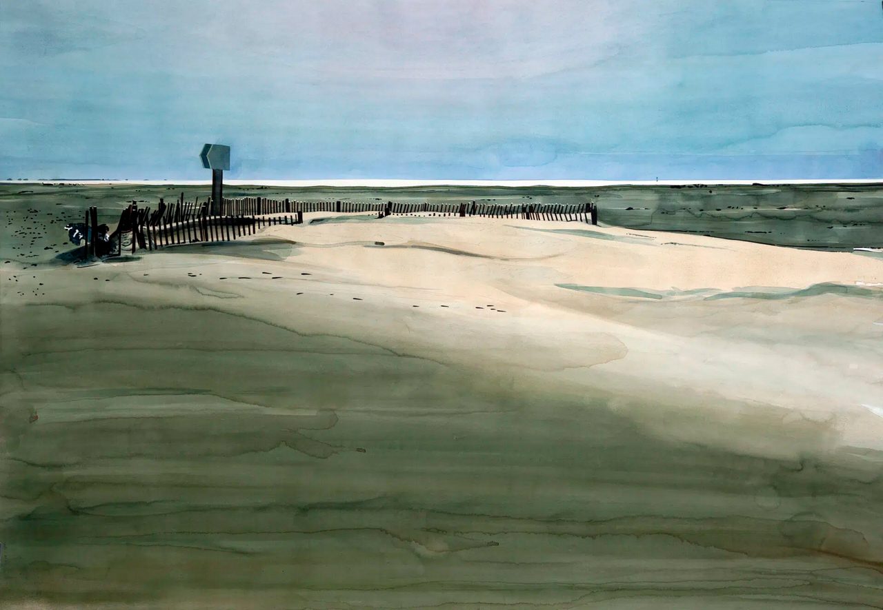 Industrial landscapes rarely occupy the center of painting’s poetic imagination. Ports, construction sites, logistics platforms, and suburban wastelands are generally associated with function rather than contemplation. Yet the work of Yvan Salomone transforms precisely these environments into sites of visual and conceptual tension. In his large-scale watercolors—dedicated almost exclusively to ports, infrastructures, and peri-urban territories—raw materials such as containers, cement, steel, and rusted barrels confront the transparency of watercolor. From this contradiction emerges the distinctive atmosphere of Salomone’s work: landscapes that remain anchored in reality while appearing strangely suspended.