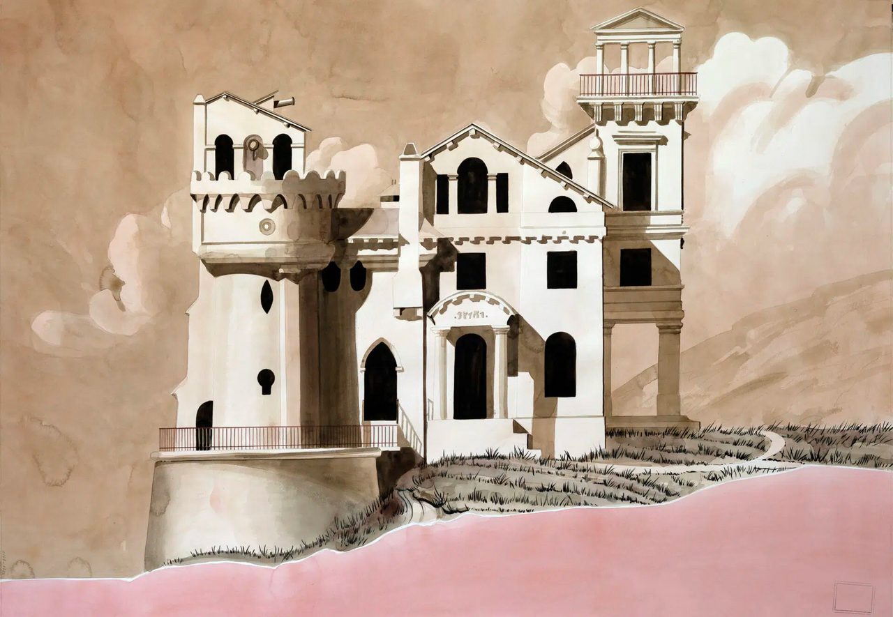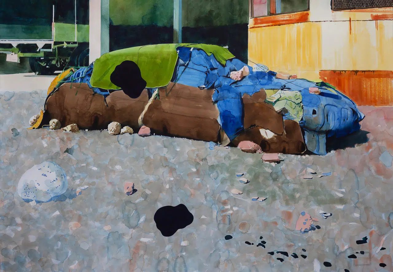In an era saturated with spectacular imagery, Salomone directs attention toward the overlooked territories of modern life: shipping terminals, parking lots, industrial fringes, zones of logistical circulation. These spaces, often considered visually unremarkable, become sites of unexpected beauty when filtered through the fragile medium of watercolor.