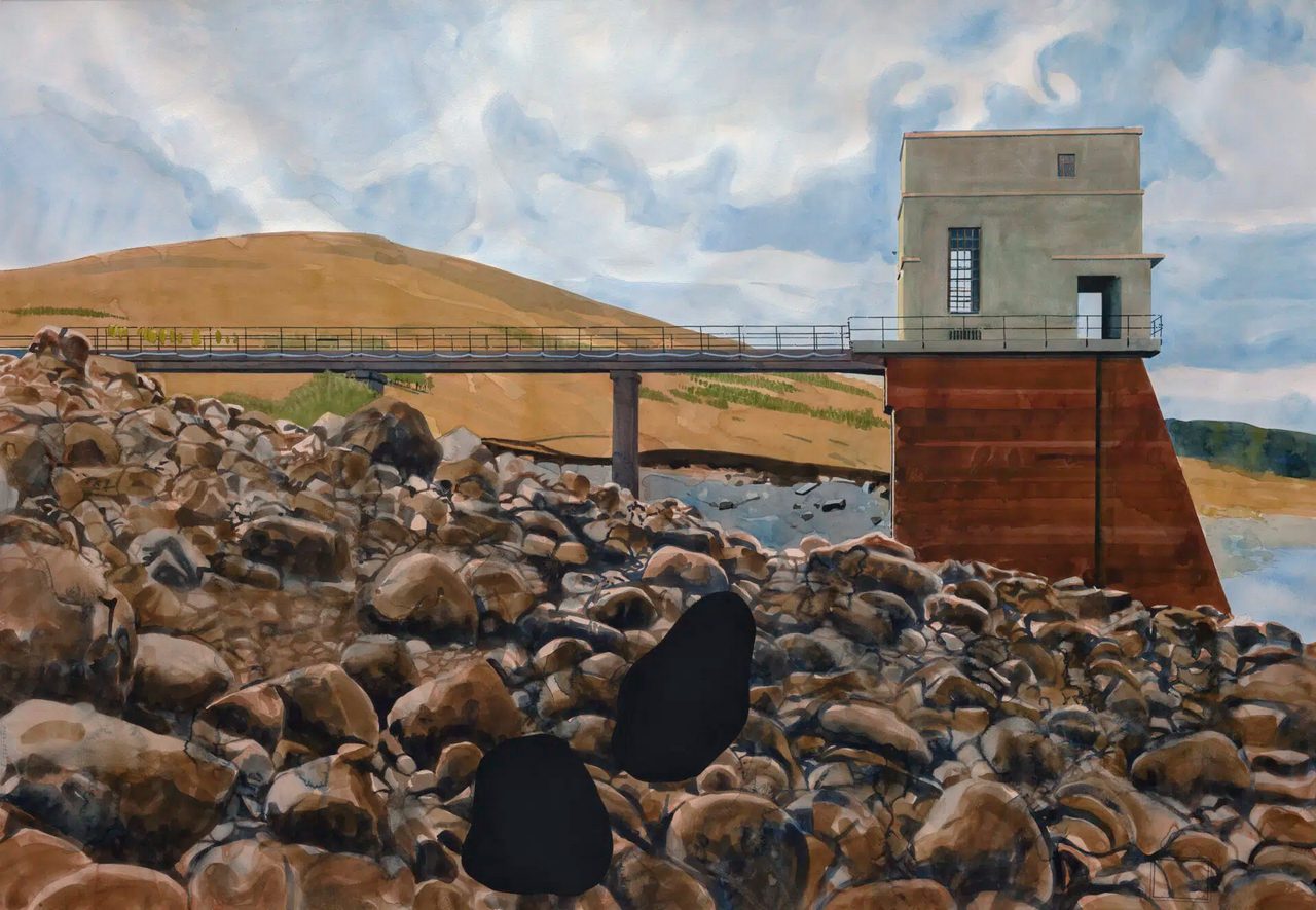Watercolor, by contrast, is historically associated with immediacy, transparency, and fragility. The pigment dissolves in water, spreads across paper, and dries into luminous stains that resist correction. This medium produces a sense of volatility—an effect seemingly incompatible with the solidity of industrial matter.