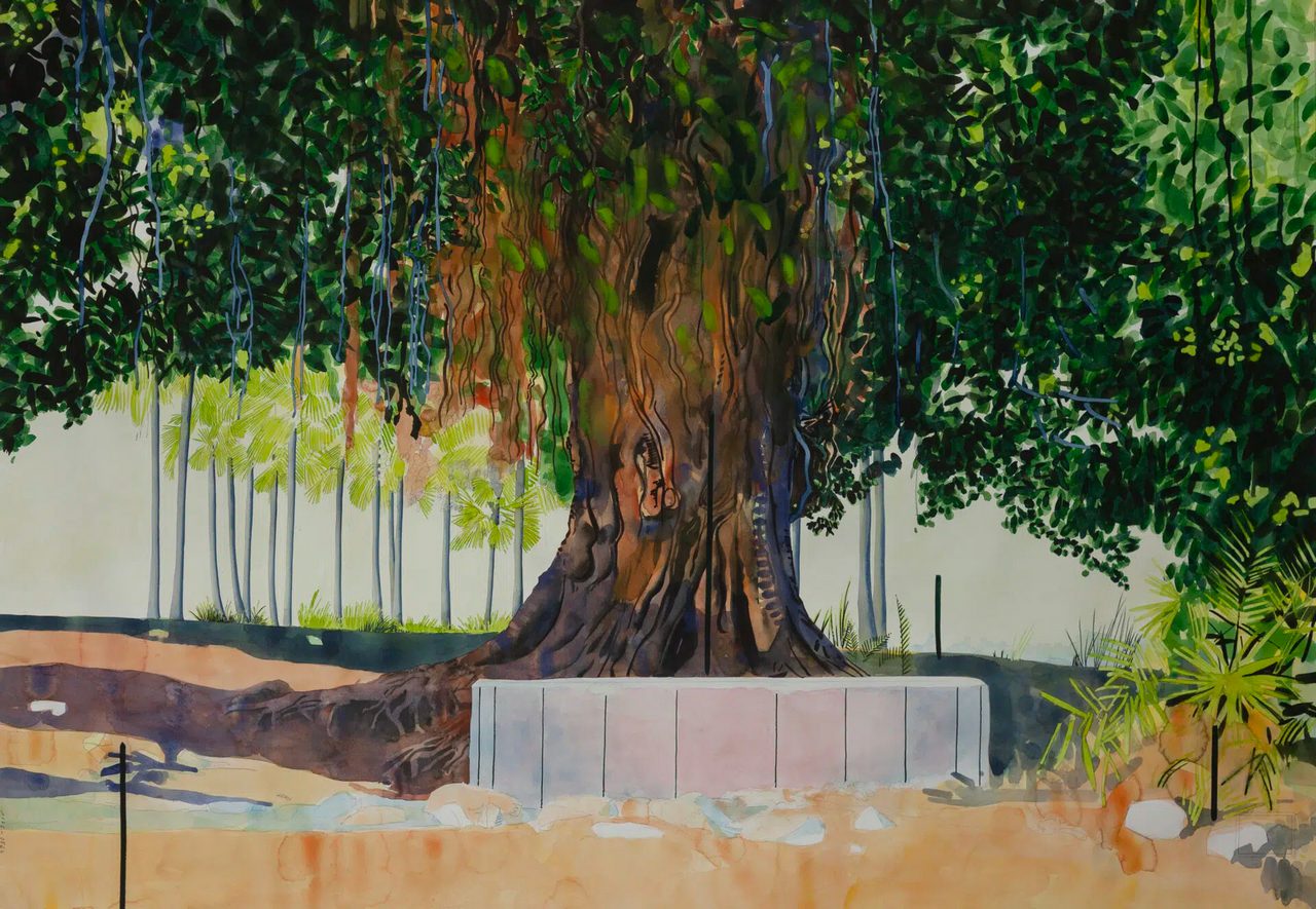 The images that later become watercolors originate in the artist’s physical wandering through these environments. One might imagine Salomone moving through ports and industrial outskirts by bicycle, car, or on foot, pausing when an ordinary element arrests his attention: a wall, a shed, a façade, an isolated tree.
