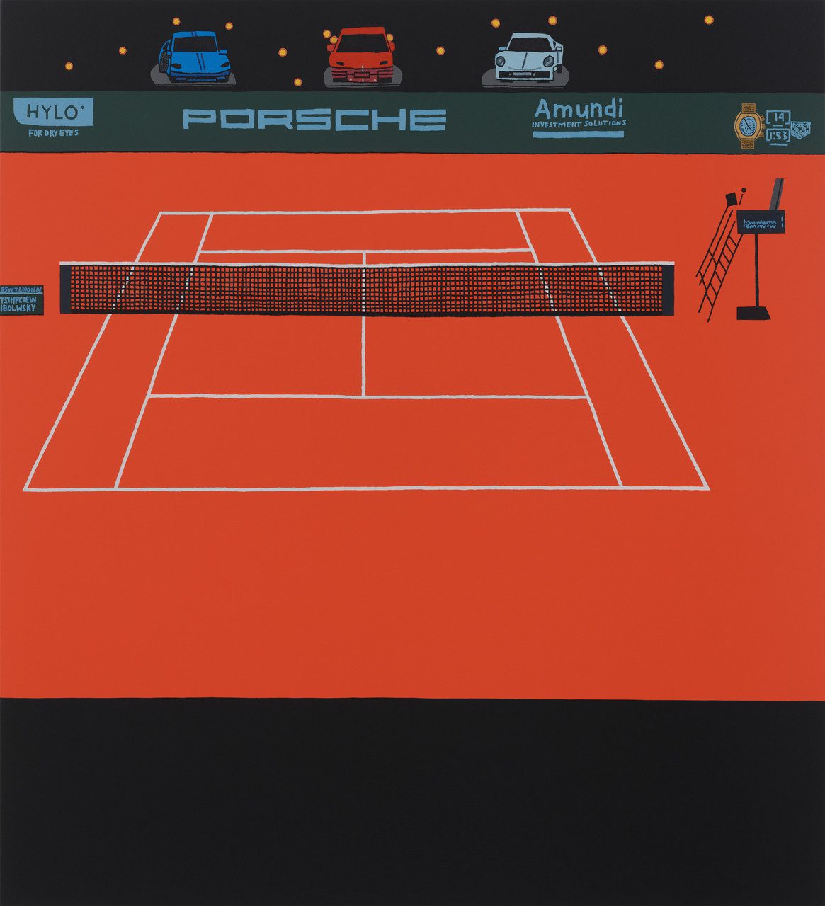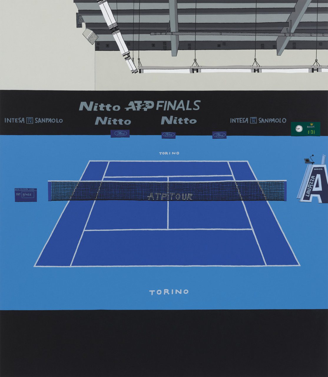 The tennis court, with its standardized dimensions and varied color schemes, offers Wood a structure for serial experimentation. Each composition functions as a controlled system in which repetition and variation operate simultaneously. Saturated hues—emerald greens, clay reds, and electric blues—capture the distinctive surfaces of grass, clay, and hard courts. Nets, umpire chairs, courtside signage, and advertising banners punctuate the compositions, marking the subtle distinctions between one stadium and another.