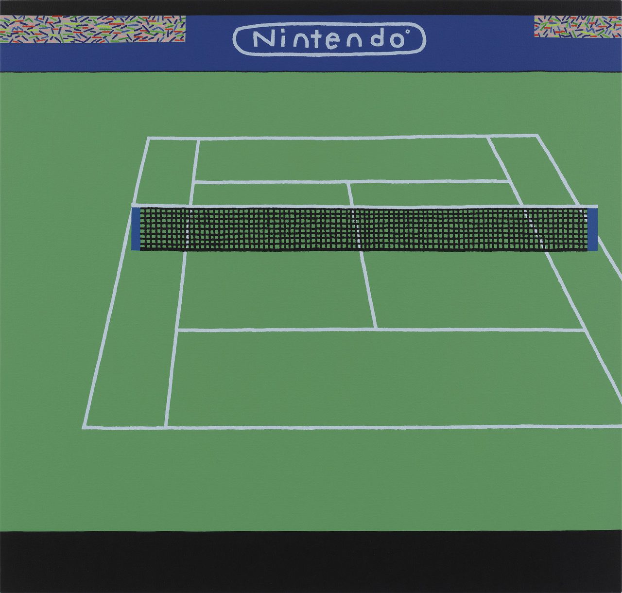 Wood’s courts are often framed by large, solid black passages along the edges of the canvas. These areas evoke the experience of watching tennis on television in a darkened room, situating the viewer simultaneously inside the stadium and within the domestic space of spectatorship. The paintings thus reflect not only the spectacle of sport but also the mediated conditions through which most audiences encounter it.