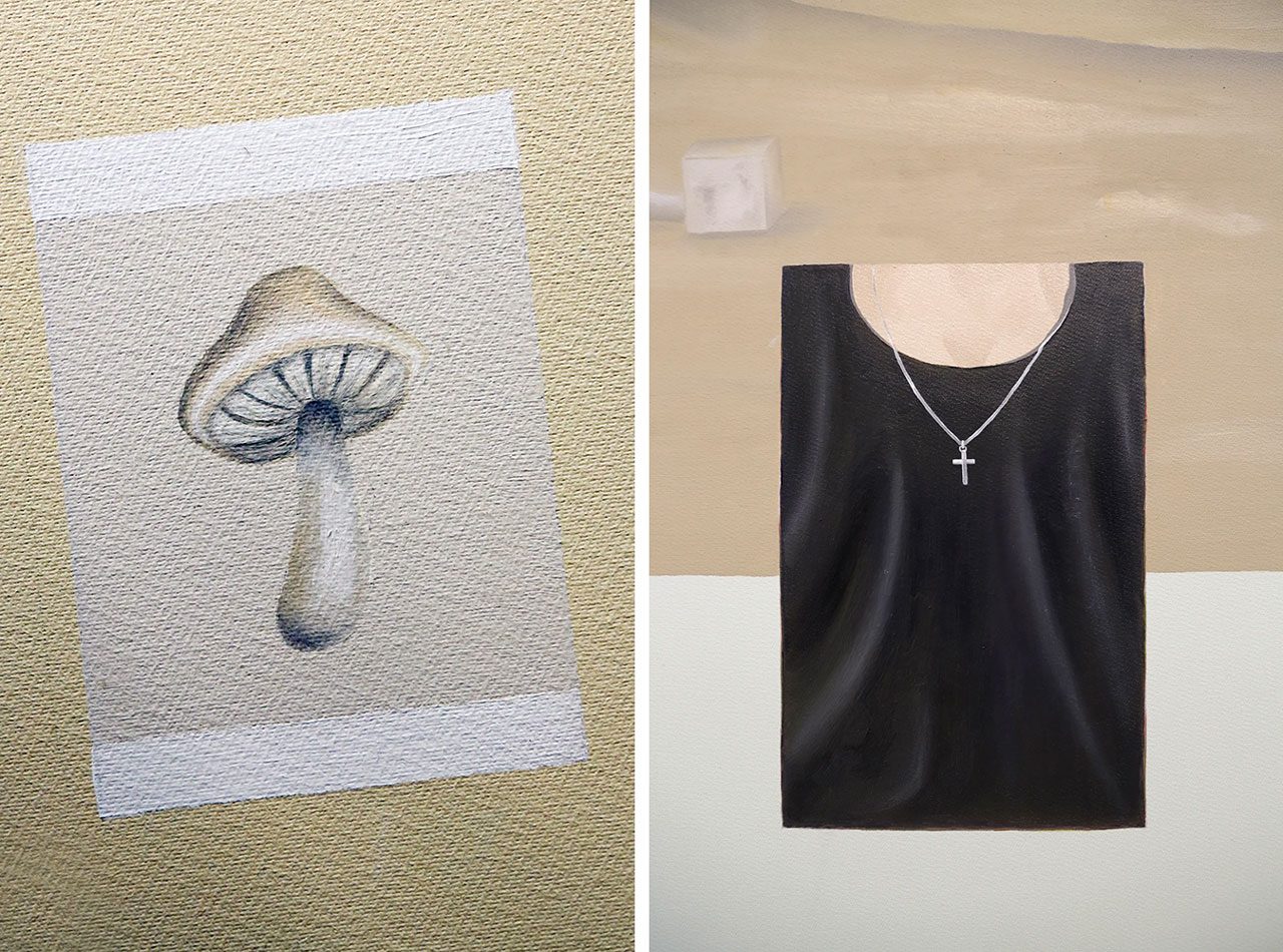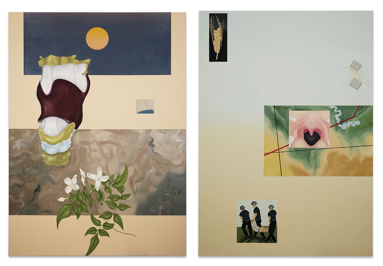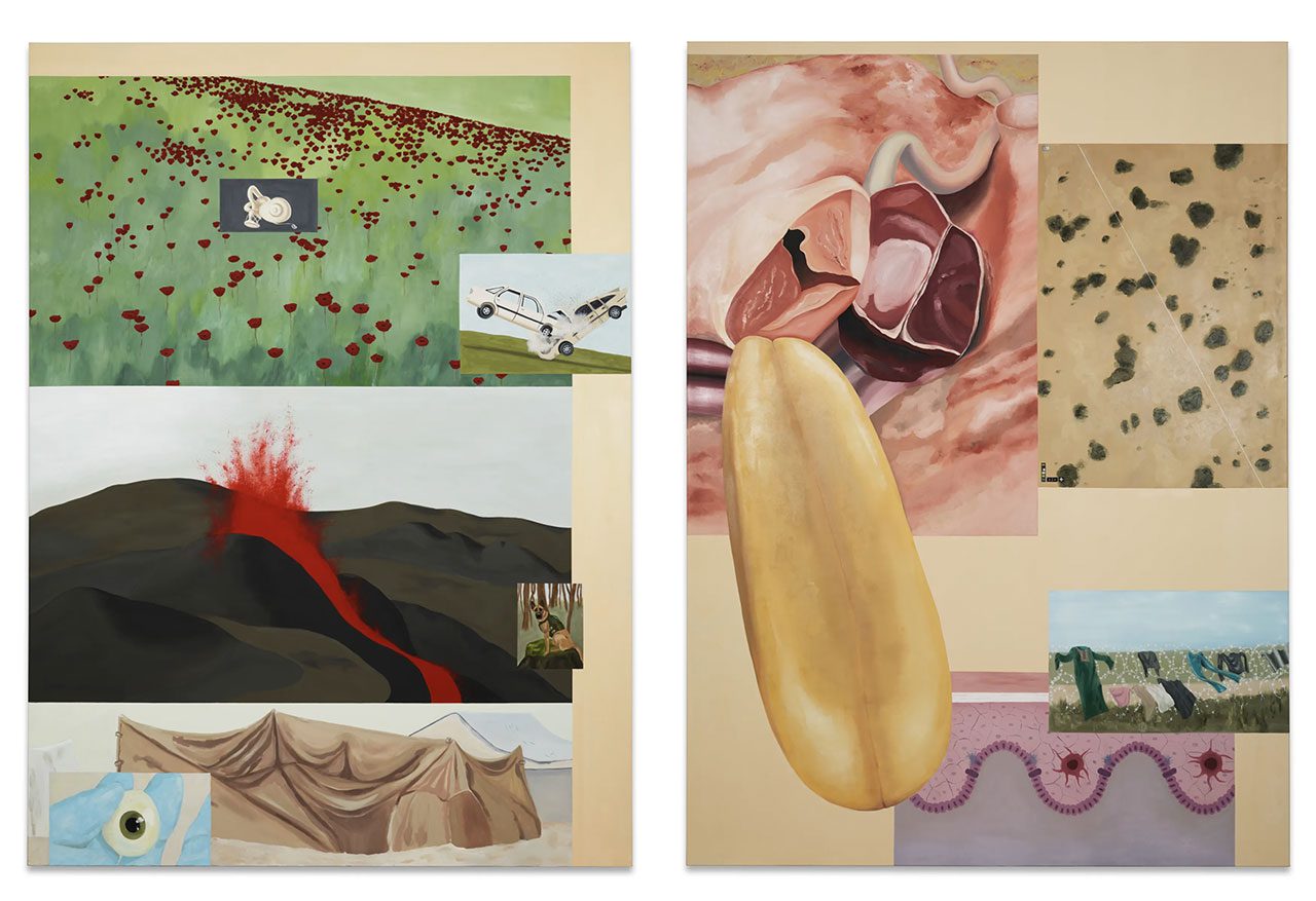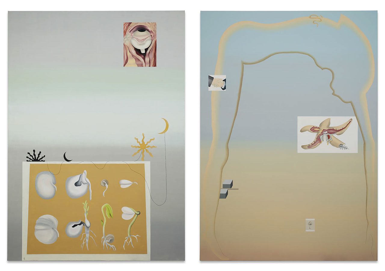 The paintings, produced between 2023 and 2026, move fluidly between figuration and abstraction. They assemble fragments of imagery—biological forms, symbolic motifs, and cultural references—into layered compositions that resist straightforward interpretation. These images appear almost digitally placed onto the canvas, arranged through association rather than narrative logic.