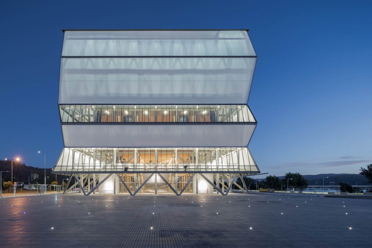 In Chile he has continued to design landmark buildings. The VIK Millahue Winery (2013) is a long, low-slung vineyard complex integrated into the landscape. Radić placed rows of vineyard trellises beside the building and even “bestrew the ground” with rocks at the entry, creating a dramatic dialogue with the rural setting. In Santiago, Radić transformed an early-20th-century damaged residence into NAVE Performing Arts Center (2015). The project preserved much of the old structure and added a circus-tent roof, turning it into a venue for performance and workshops while layering new and old.