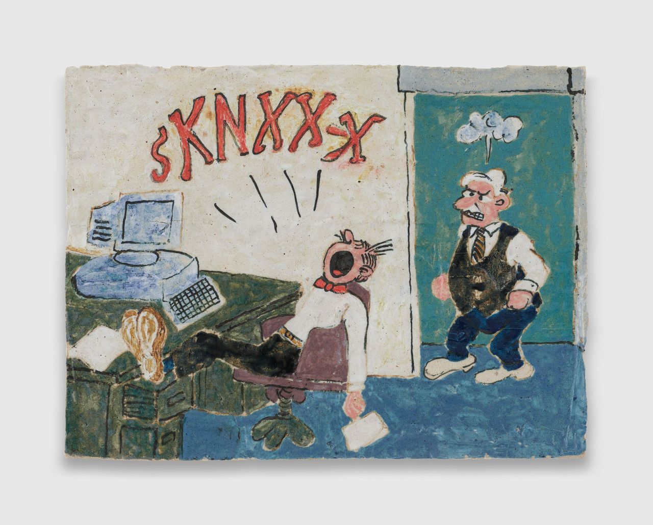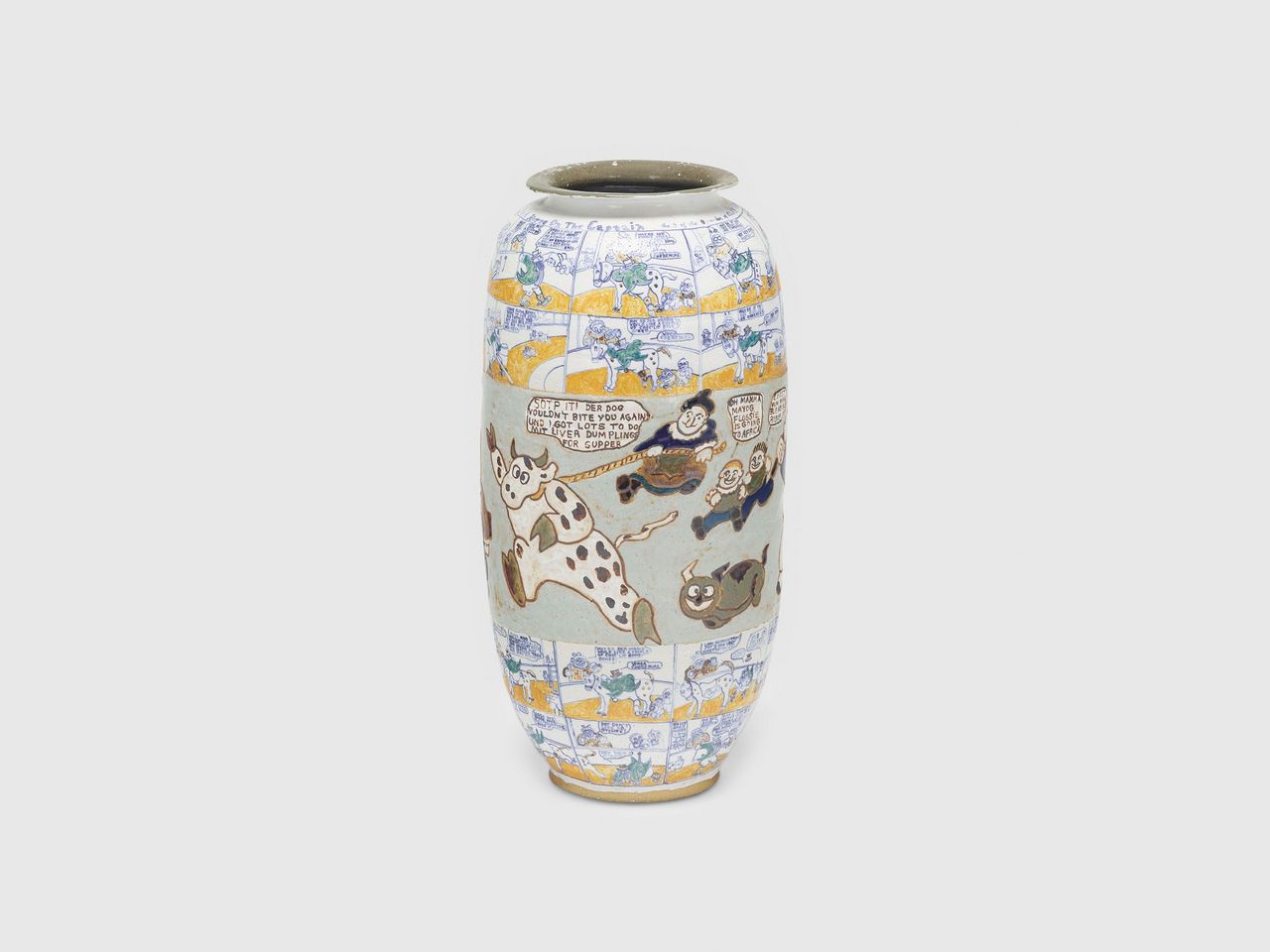 The collaborative works with Michael Frimkess demonstrate a productive tension: his wheel-thrown vessels, informed by classical forms such as Greek kraters and Chinese ginger jars, serve as a structured ground for her spontaneous, irreverent mark-making. This interplay between discipline and improvisation defines much of their shared output.