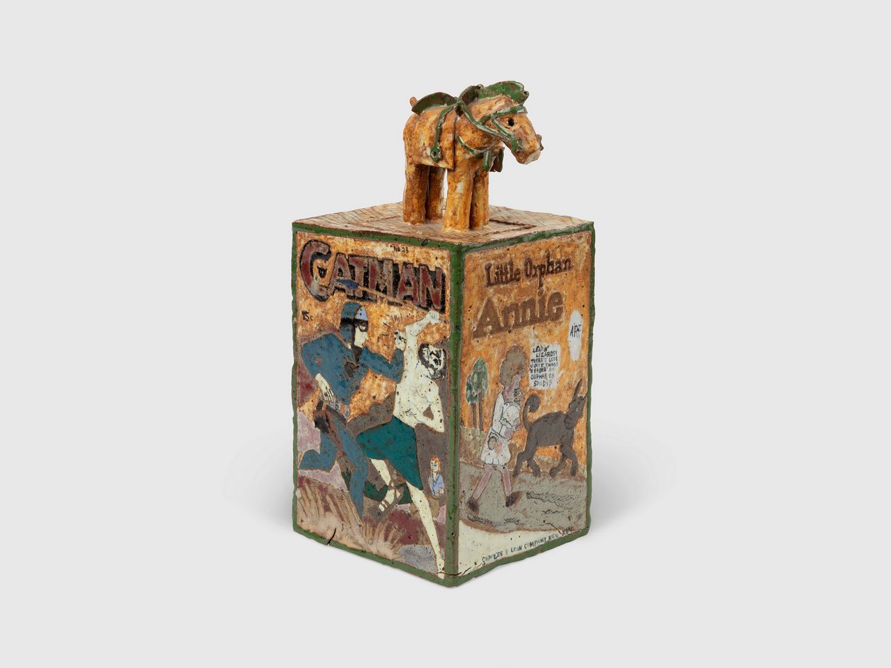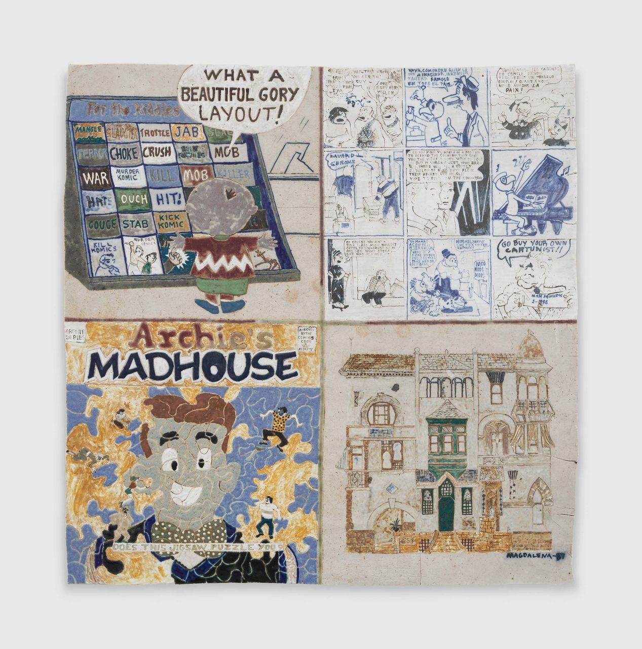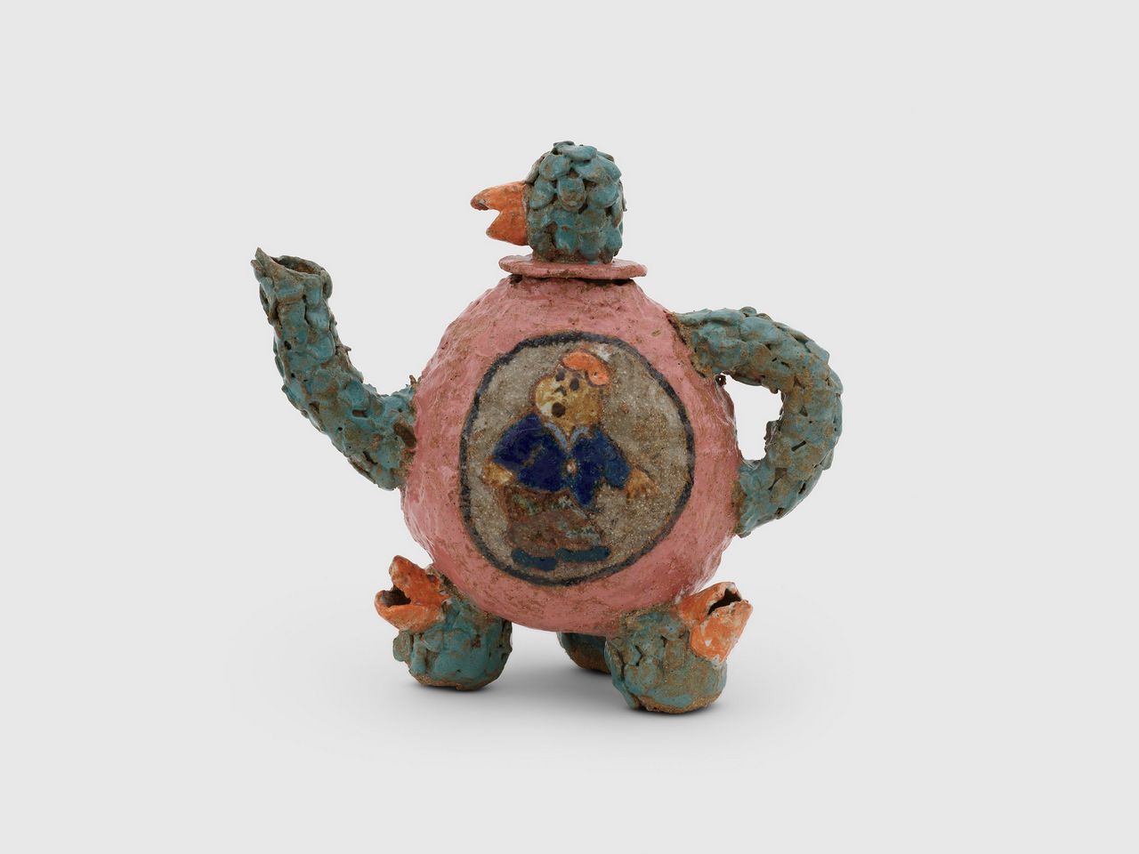 A longtime resident of Venice Beach, Suarez Frimkess has built a distinctive visual language rooted in both high and low culture. Her ceramics frequently incorporate familiar iconography—figures such as Mickey Mouse or the Chilean comic character Condorito*—alongside references to Latin American history, decorative traditions, and her immediate surroundings. The result is a body of work that is at once playful and deeply informed, collapsing boundaries between popular imagery and art-historical form.