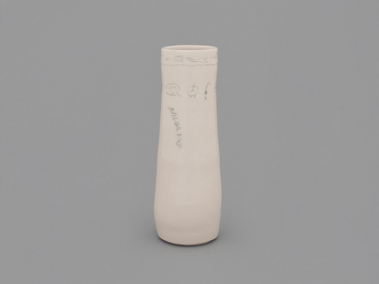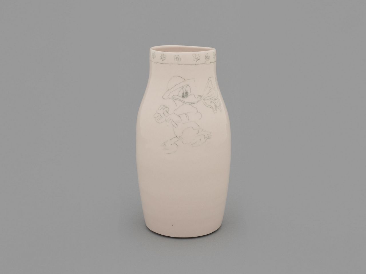Their collaboration also carries a practical and symbolic dimension. When Suarez Frimkess was no longer able to produce ceramic forms herself, Kusaka stepped in to create vessels for her to draw upon. Using underglaze pencil, Suarez Frimkess continues to inscribe her imagery onto these surfaces—an adaptation that preserves the immediacy of her hand while introducing a new layer of artistic dialogue.