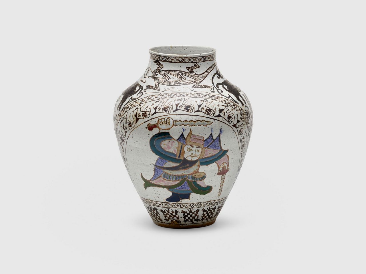 Her trajectory shifted again in 1962 when she moved to Port Chester to participate in a residency at the Clay Art Center. There she met Michael Frimkess, her lifelong partner and collaborator. The couple eventually settled in Venice Beach in 1971, where they established a studio practice that fused her graphic sensibility with his technical mastery of ceramics.