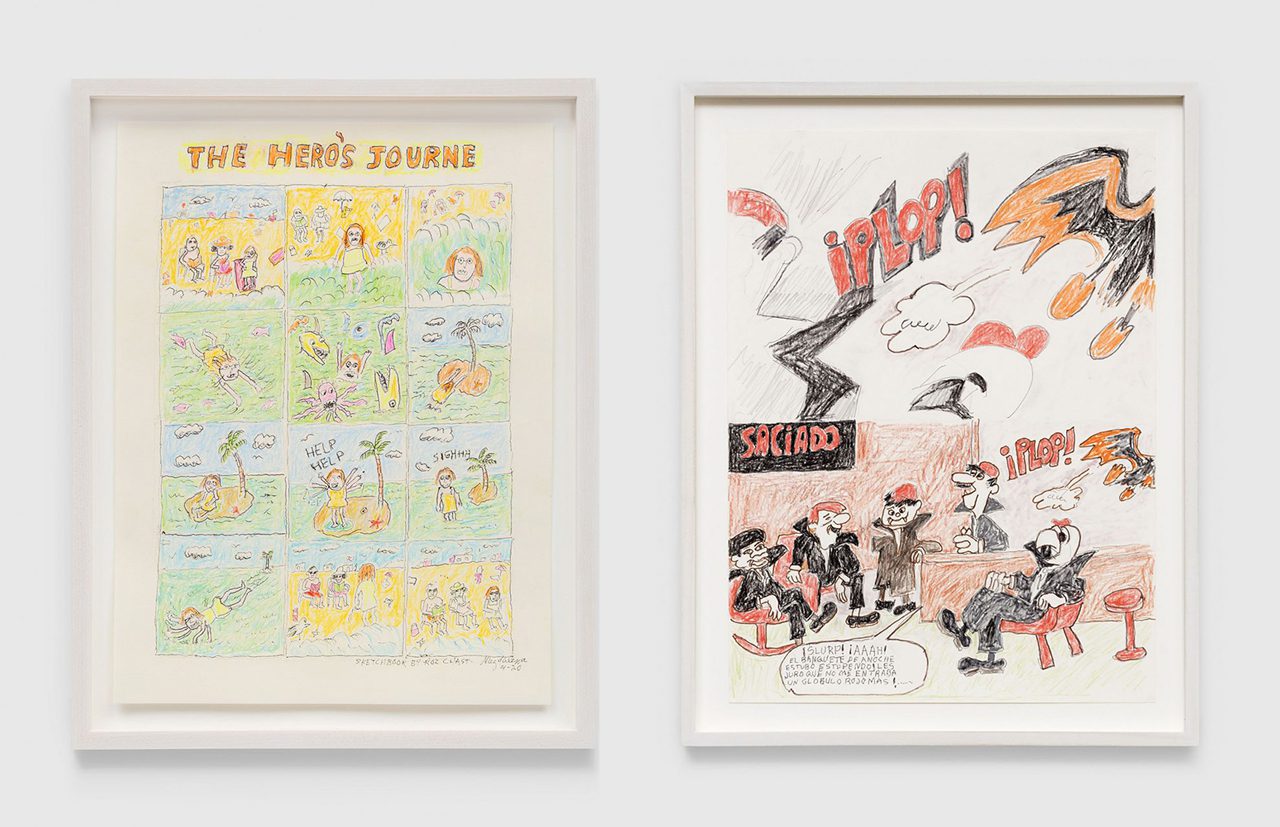 Right: Magdalena Suarez Frimkess, Untitled, 2017, Colored pencil, pen, marker, and graphite on paper15 3/4 x 11 3/4 inches (40 x 30 cm), Framed: 18 1/4 x 14 1/4 inches (46.4 x 36.2 cm), Courtezy David Zwirner Gallery