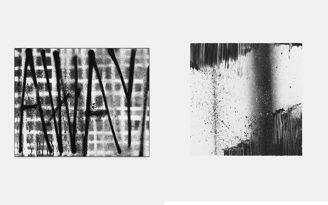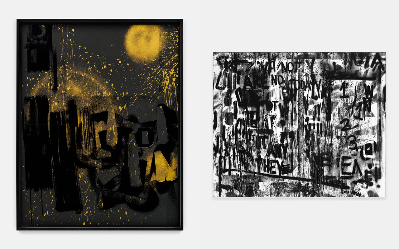 Right: Adam Pendleton, Untitled (Days), 2022, Silkscreen ink and black gesso on canvas 50 x 60 in. (127 x 152.4 cm), Courtesy Adam Pendleton Studio